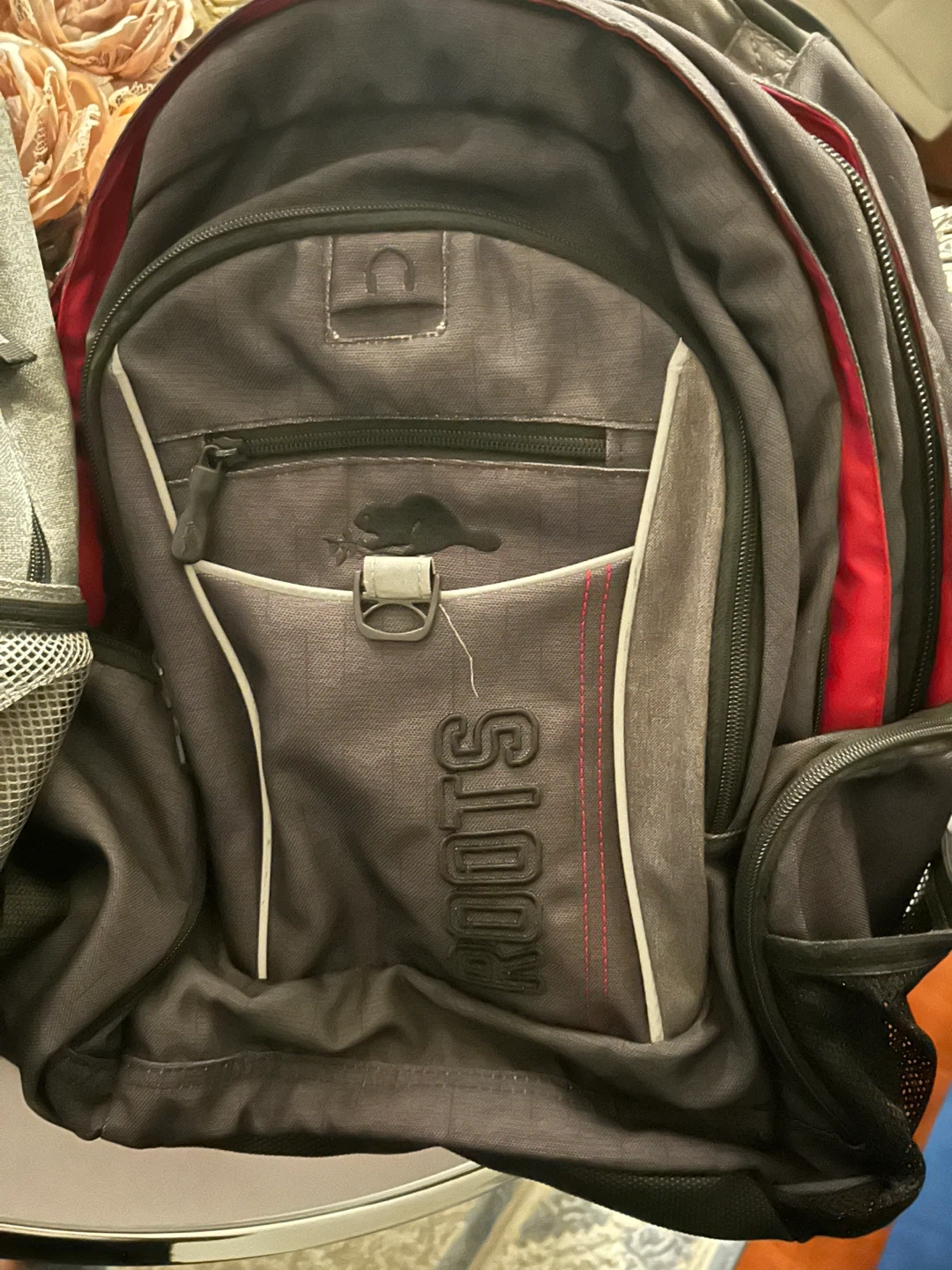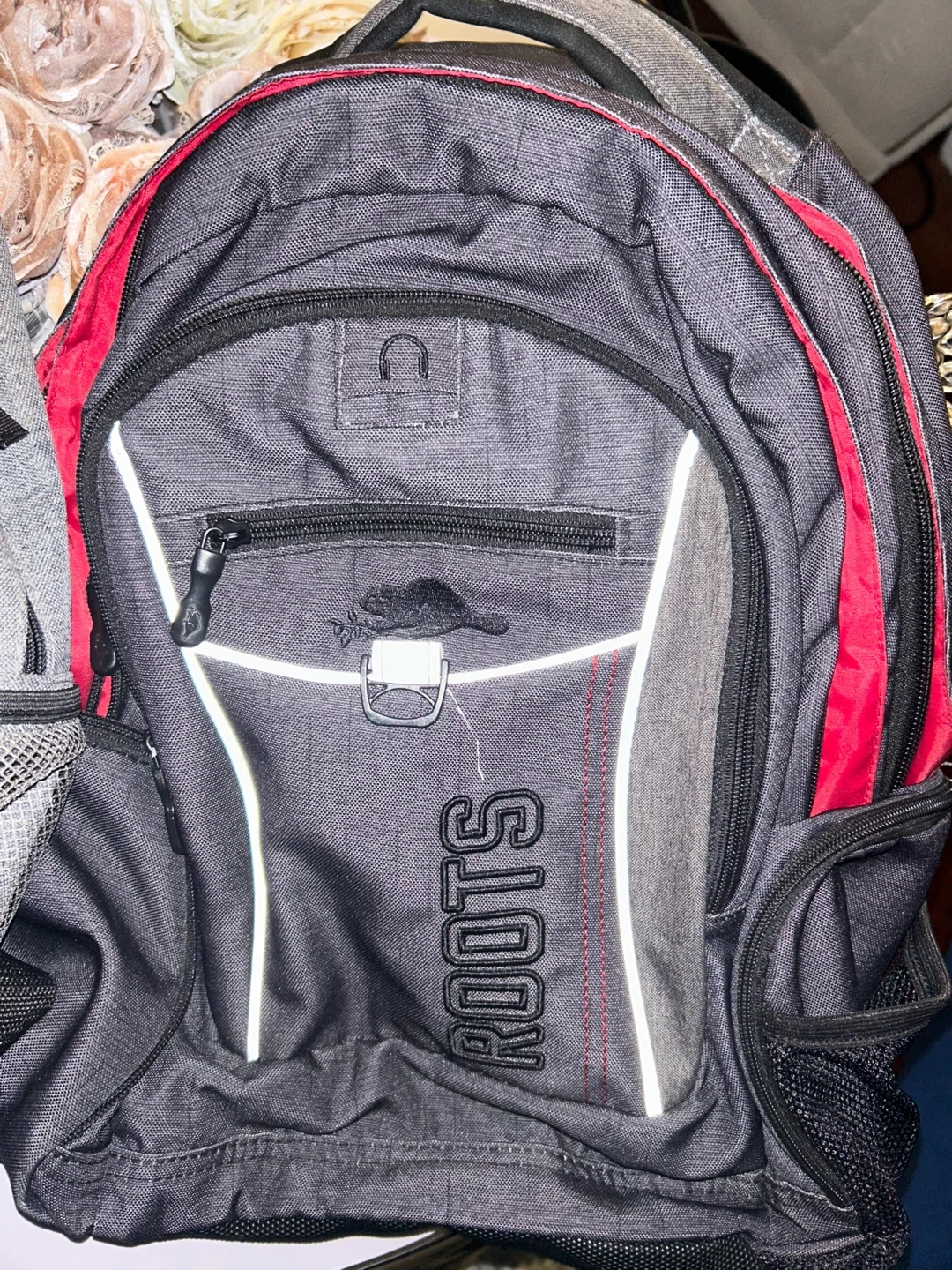 Selling a Roots backpack in good condition! It's a stylish grey with red accents. Perfect for school, work, or travel. It has multiple compartments to keep your things organized