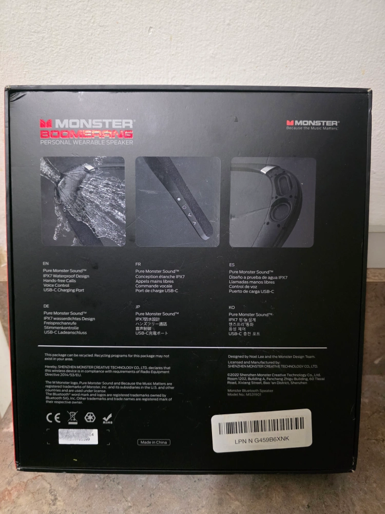 137Selling a like new Monster Boomerang personal wearable speaker! It's still in the box and has never been used. Key features include: - Pure Monster Sound - Hands-free calls - USB-C charging port Comes with all original components and packaging