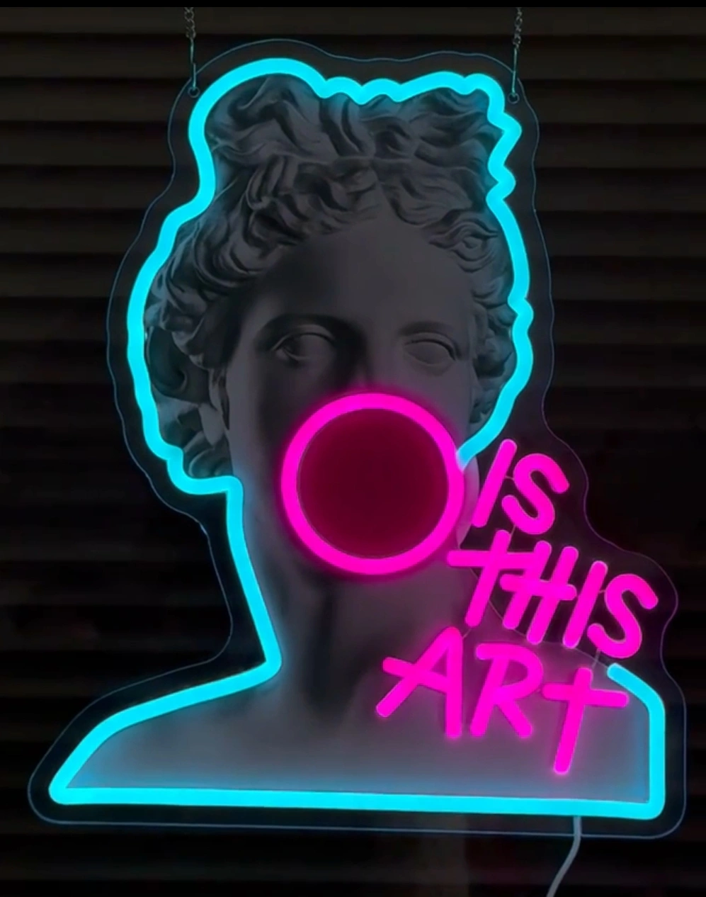 185Add a pop of colour to your space with this fun neon sign! It features a statue blowing a pink bubble with the words "Is This Art" in bright pink neon. The statue is outlined in a cool blue neon glow, making it a unique and eye-catching piece of decor