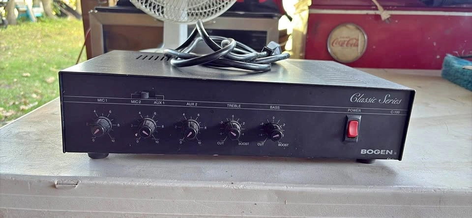 Bogen Analog Amplifier - Classic Series, 100 WATT C100 The Bogen Classic Series C35, C60, and C100 are public address mixer amplifiers designed to combine microphone, telephone, and auxiliary inputs, featuring outputs for 4-ohm (direct), 8-ohm (C35 & C60 only), 16-ohm, 25V, and 70V speaker systems, along with jacks for recording, booster amps, or 600-ohm telephone line connections using the optional WMT1A transformer. Bogen Analog Amplifier - Classic Series, 100 WATT C100 Features & Specifications: Each input controlled by an independent volume control Treble and bass controls AUX muting by external contact closure for push-to-talk microphones TEL input for telephone paging applications TEL input voice-activated (VOX) mute over AUX input Variable threshold for TEL input voiceactivated AUX mute