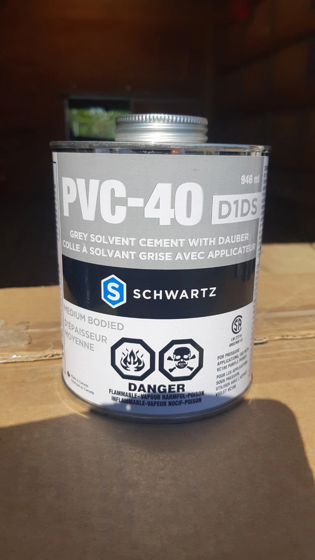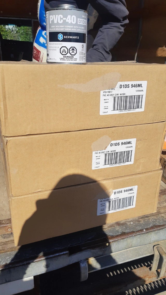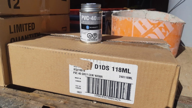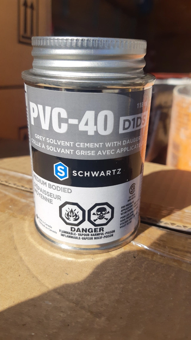 PVC-40 -D1DS- Grey solvent Cement with dauber Brand: Schwartz The Schwartz PVC-40 Grey PVC Cement is used for bonding PVC to PVC pipes for both Non-Pressure and Pressure applications. 946ml Stock 3 boxes = 12 cans (each box) Price $160 per box 118ml Stock 1 box = 24 cans (each box) Price $120 per box Sold only by box Condition: New For Sale By: Owner