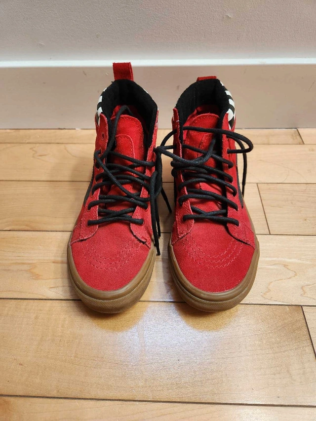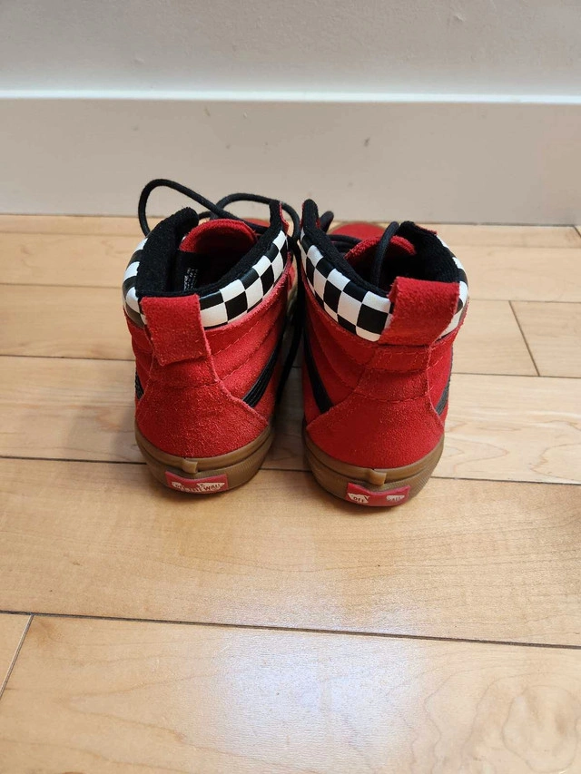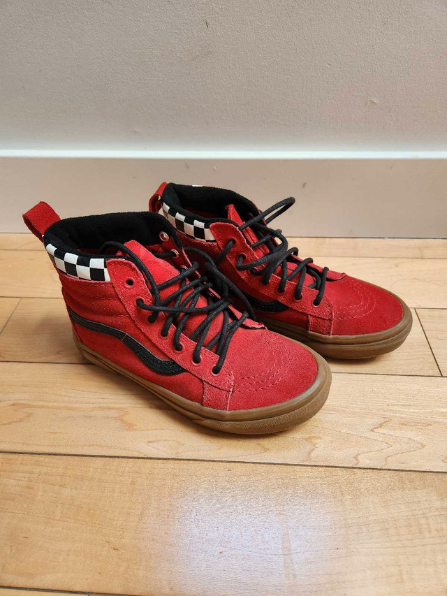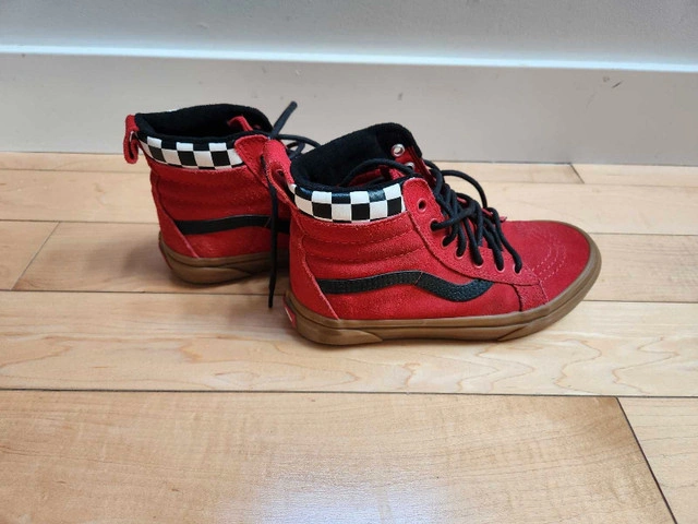 Selling a pair of vans sk8-hi mte checkerboard/racing red & black suede high tops in excellent condition. Size 2.5 - youth/kids. Coming in a winterized leather construction, these shoes are also scotchgarded for additional weatherproofing. A molded UltraCush outsole combined with a padded high top collar and tongue provide superb comfort no matter your activity. Comes from a smoke and pet free home.