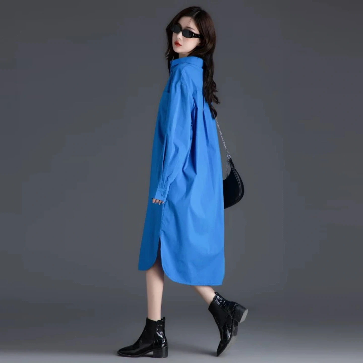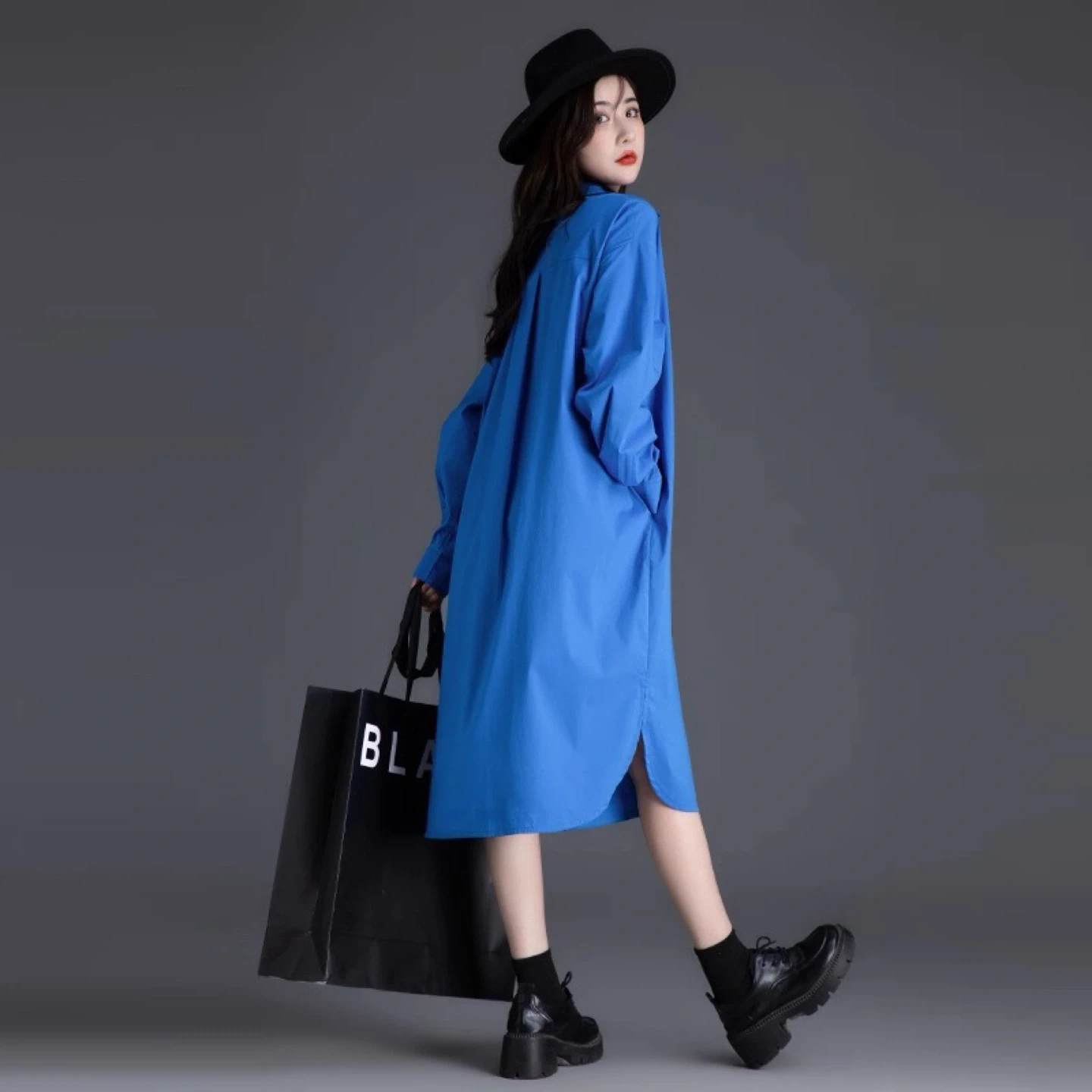 A stylish blue shirt dress, perfect for any occasion! The dress features long sleeves and a relaxed fit, making it comfortable and chic. The side slits add a modern touch. It's in great condition and ready for a new home