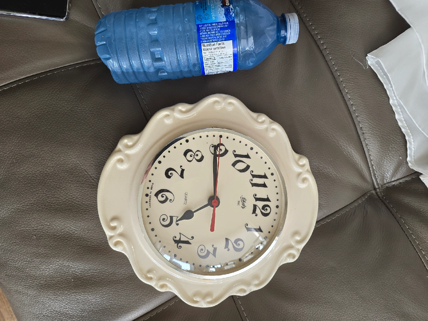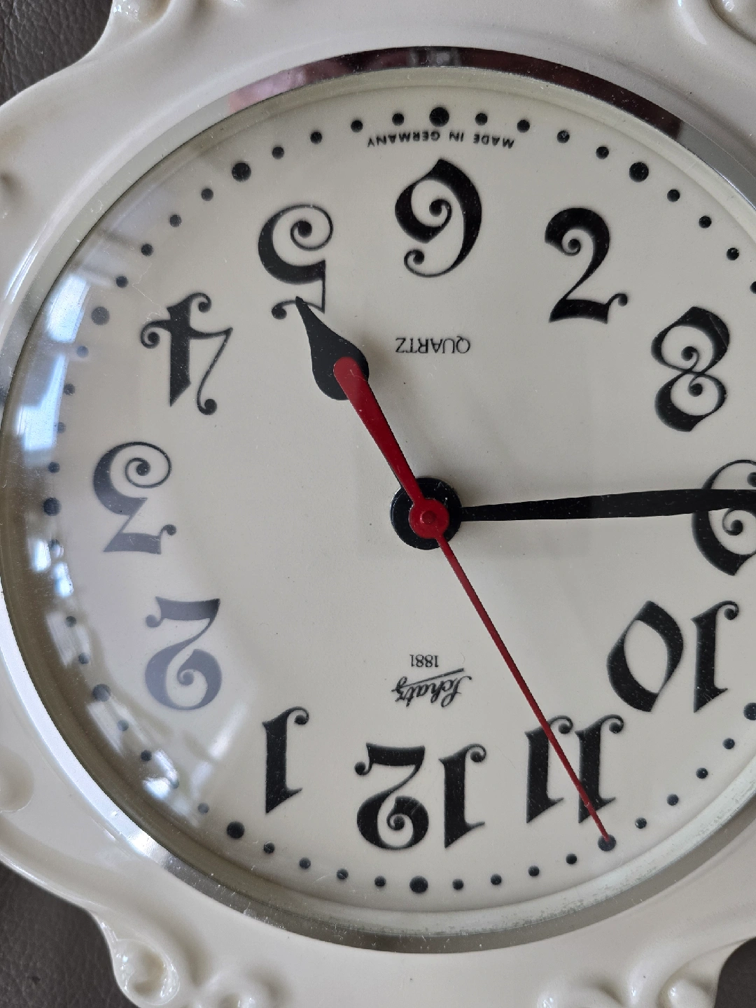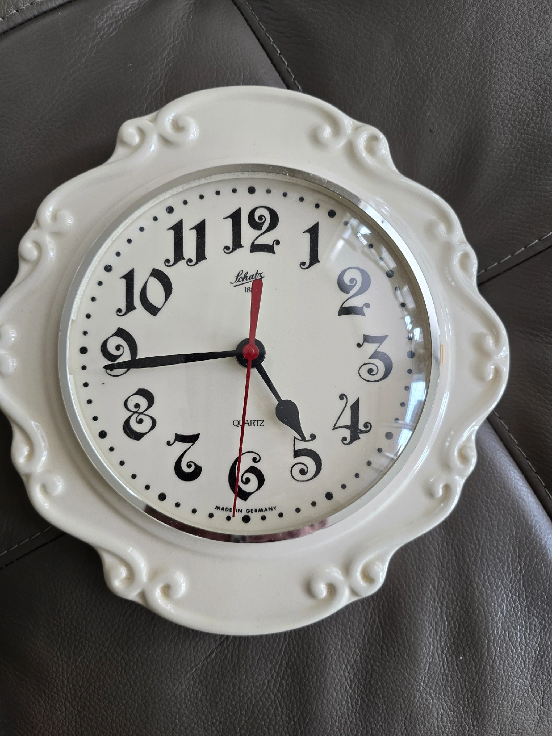 Selling a Schatz Quartz wall clock. It's cream-coloured with a decorative frame and classic numerals. "Made in Germany" is printed on the clock face. A lovely addition to any room!