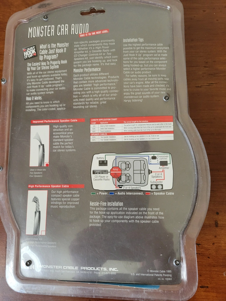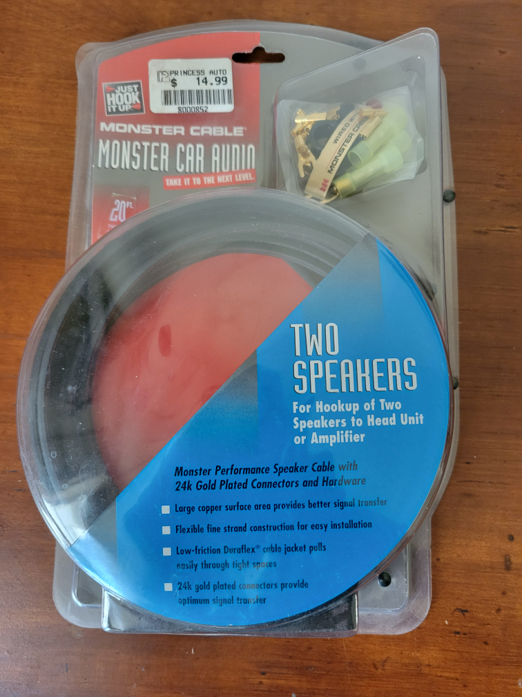 Selling a new Monster Car Audio speaker cable! It's designed for hooking up two speakers to a head unit or amplifier. The cable features 24k gold plated connectors and hardware for better signal transfer. It also has a flexible fine strand construction and low-friction Duraflex cable jacket for easy installation.