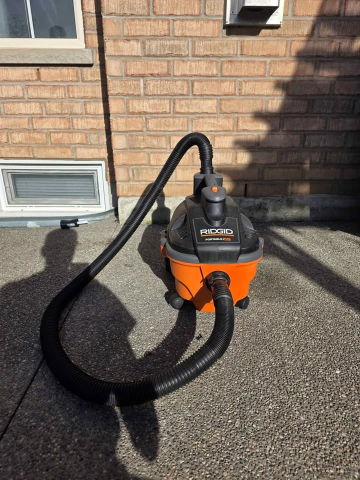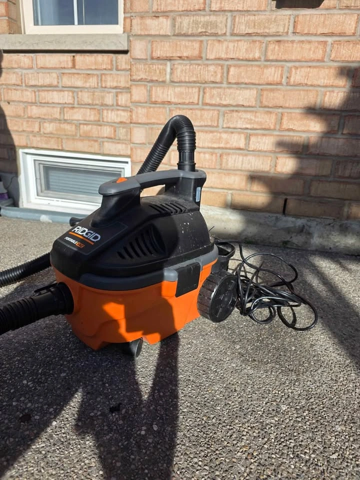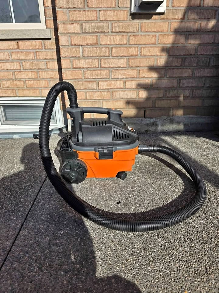 Selling a RIDGID wet/dry shop vac in great working condition. Compact and portable design, perfect for garages, basements, workshops, or car detailing. 15L / 4-gallon capacity 5.0 peak horsepower motor Includes hose and power cord Lightweight and easy to move with wheels and handle Can be used for wet and dry cleaning Pickup.