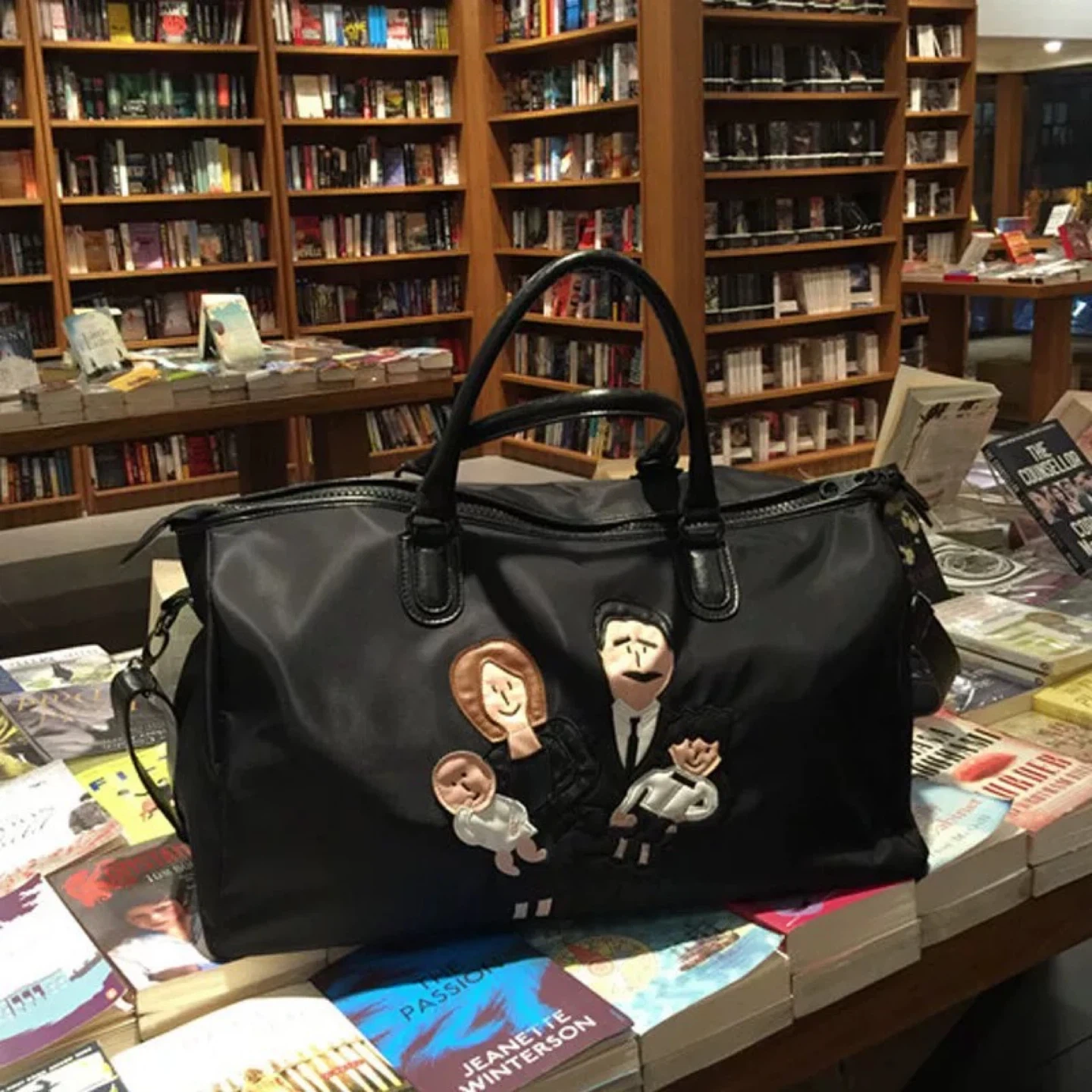 Selling a black travel bag. It's in great condition and features a unique appliqué of a family. Perfect for weekend getaways or as a carry-on!