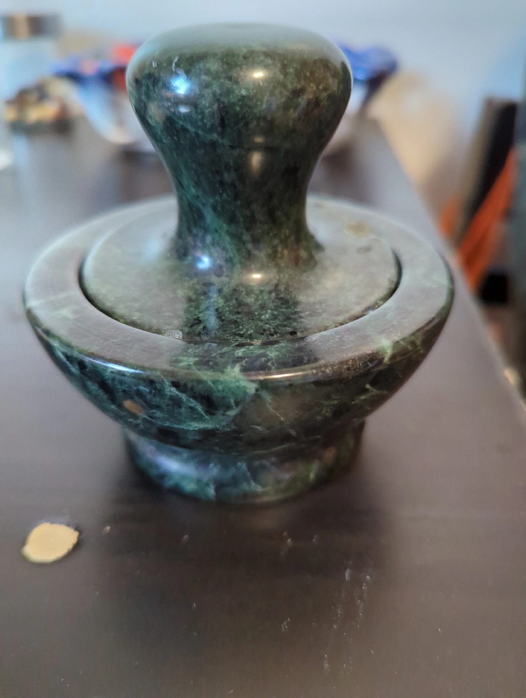Selling a beautiful green marble mortar and pestle set. It's in great condition and ready to help you grind herbs and spices with ease! The set has a lovely, natural stone pattern.
