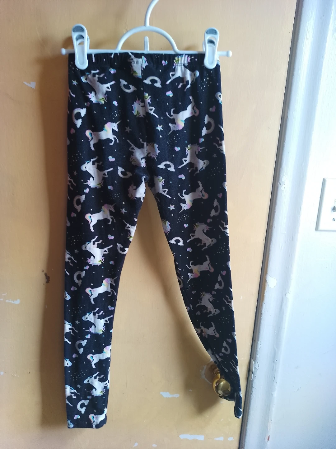 Black leggings for girls featuring a fun unicorn and rainbow print. Made by Bobbie Brook. Size M (7/8).