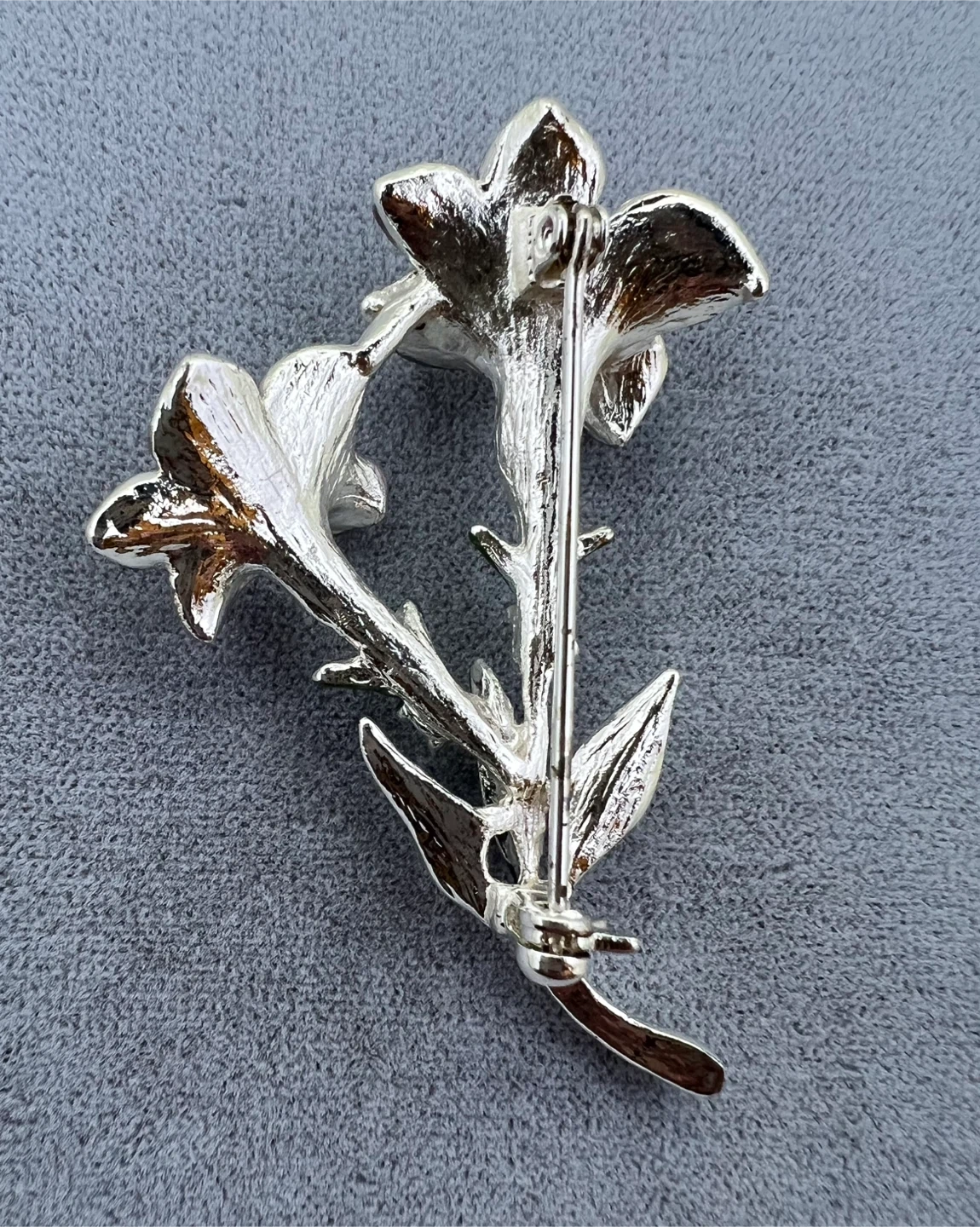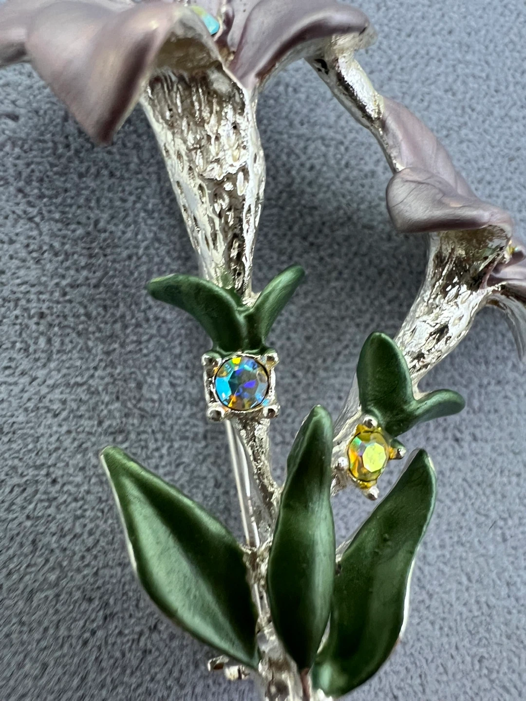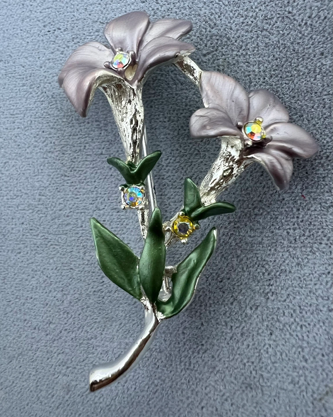 Layered petals shimmer with rich enamel, accented by sparkling rhinestones and finished with delicate silver inlay for a touch of timeless beauty