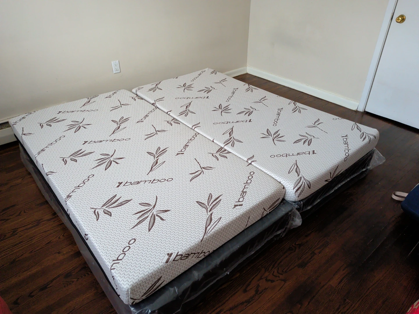 Two twin-sized mattresses feature a bamboo-patterned cover. They're still in original plastic packaging.