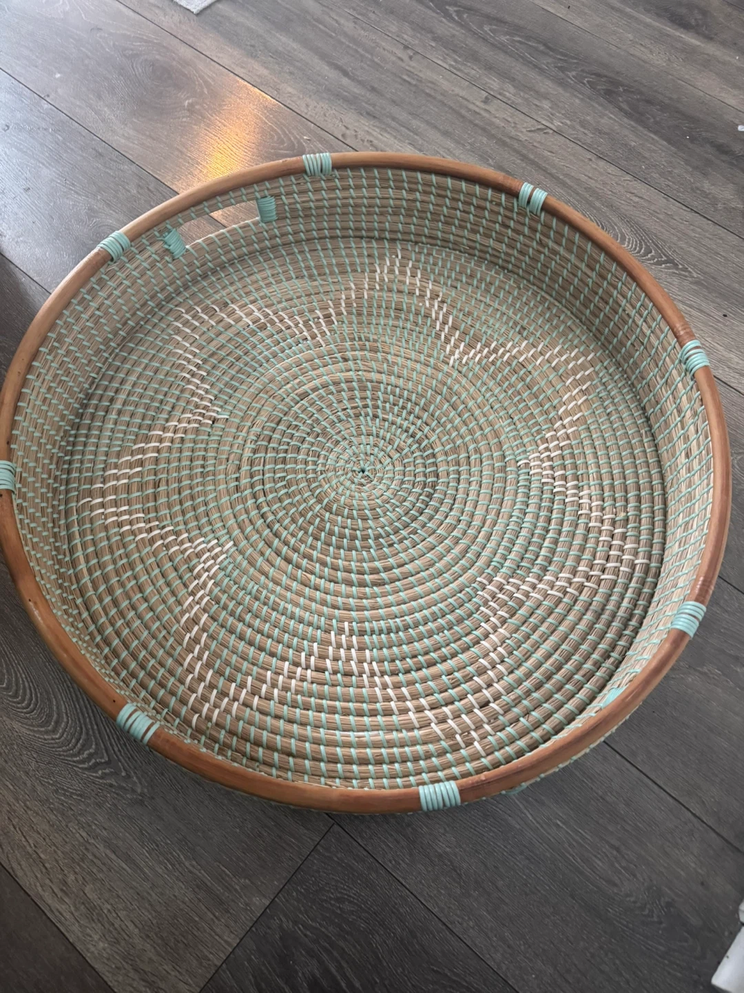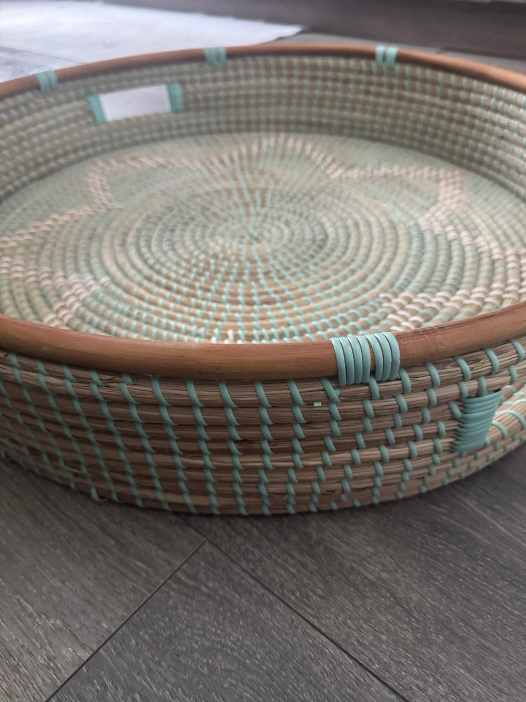 A decorative woven tray featuring a light blue and white pattern. It has a sturdy wooden rim and is perfect for serving or display. Use it on a coffee table or as a centrepiece!