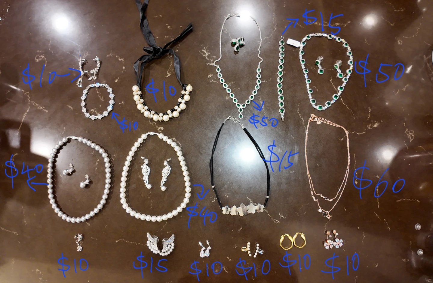 Pearl and Rhinestone necklaces, earings, and bracelets