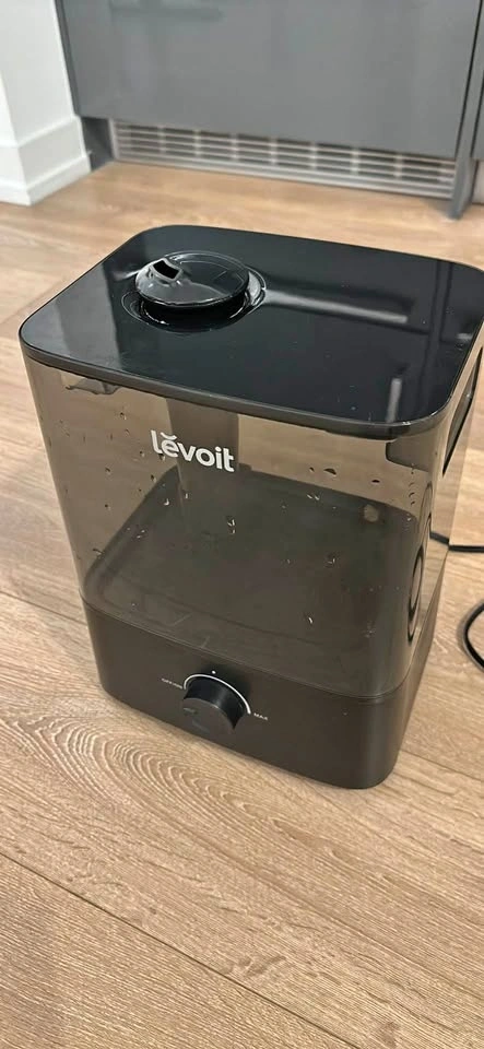 Black Levoit humidifier with a clear water tank. Features a control knob for adjusting mist level. Provides ultrasonic cool mist to keep the room comfortable without making furniture damp. In good working order. Some mineral deposits in the bottom of the tank (see photo). Comes with a pack of 8 replacement filters. Pick up in North York only.