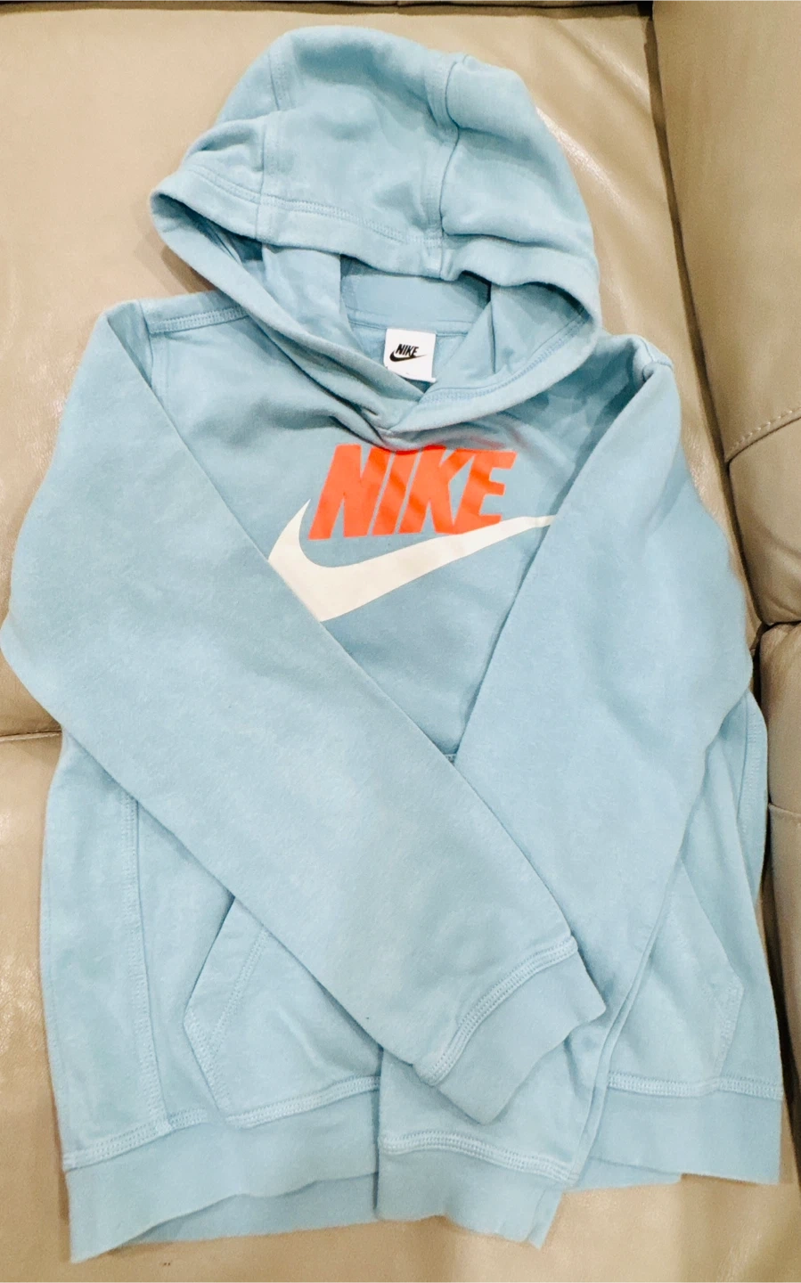 If u see add it’s available. Preloved. Light blue Nike hoodie with a large orange and white swoosh logo on the front. Pick up at midland and Lawrence, Scarborough