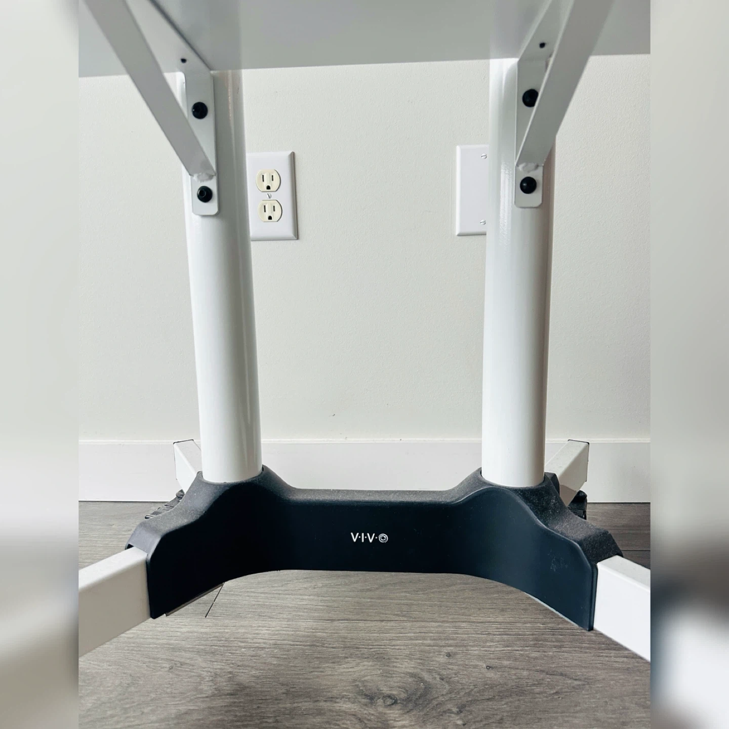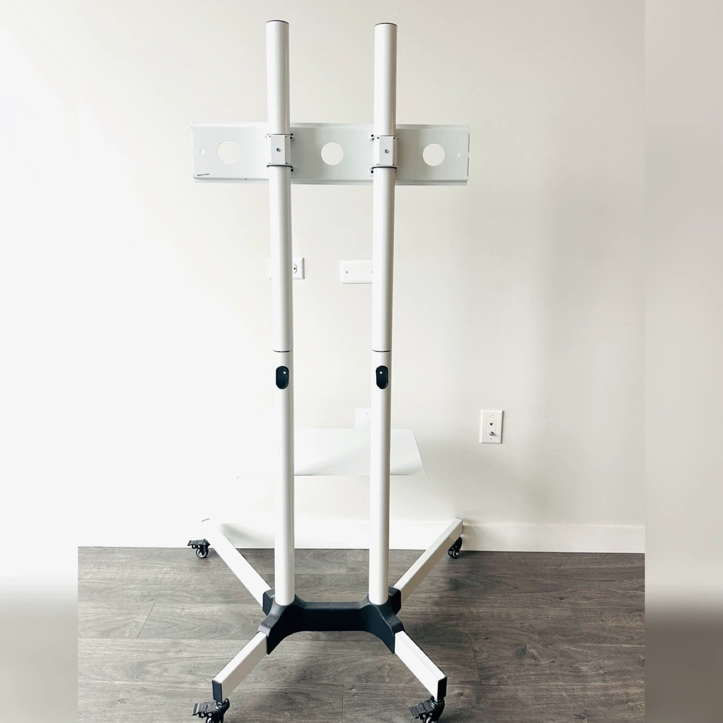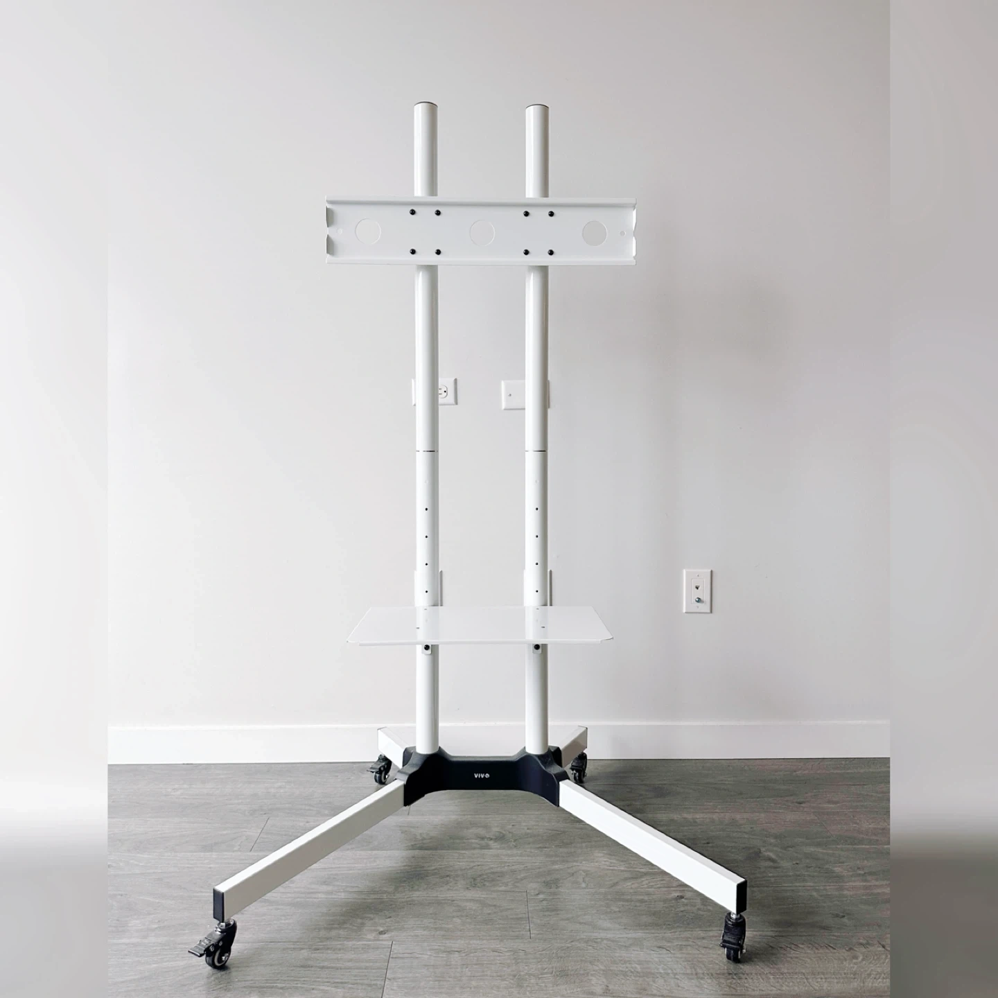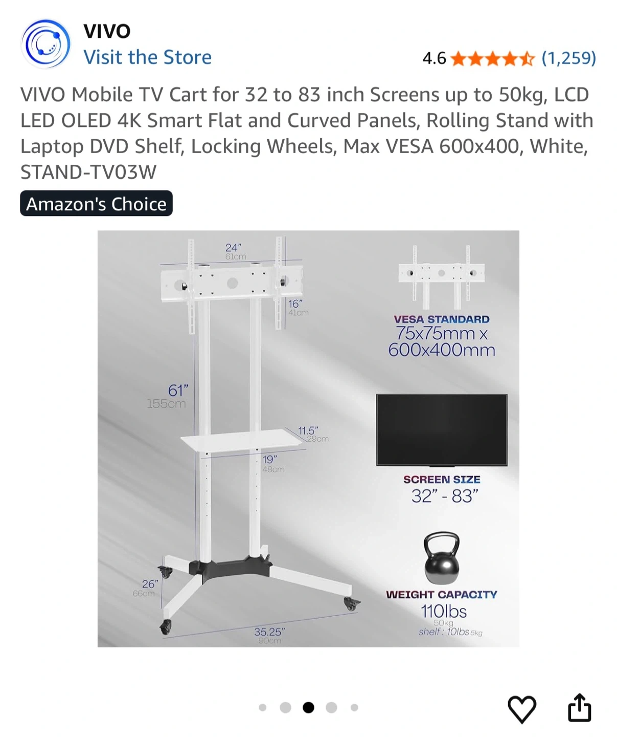 This is a white VIVO mobile TV cart stand for screens 32" to 83". It includes a laptop/DVD shelf and locking wheels. VESA mounting is up to 600x400mm.