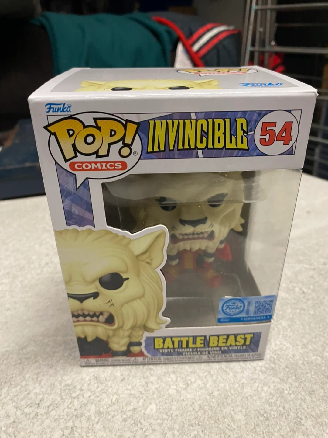 This is a Funko Pop! Comics vinyl figure of Battle Beast from Invincible. It's figure #54 in the series. It's made of vinyl. This figure is great for collectors of comic book memorabilia!