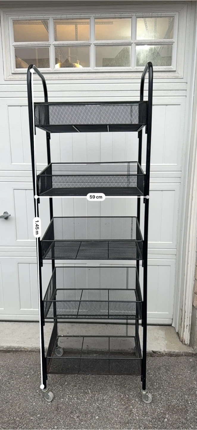 Sturdy black metal mesh rolling cart has five tiers of storage baskets. Frame is constructed from durable metal with a matte black finish. Bottom is equipped with four swivel casters for easy movement. Mesh design allows for airflow and visibility of contents.