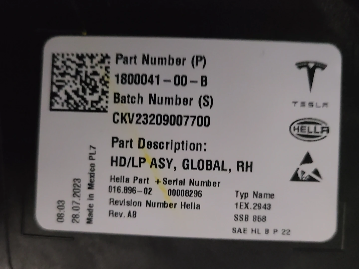 Used passenger side headlight for a 2018 Tesla Model X. See photos for connector. Great condition. Working well.