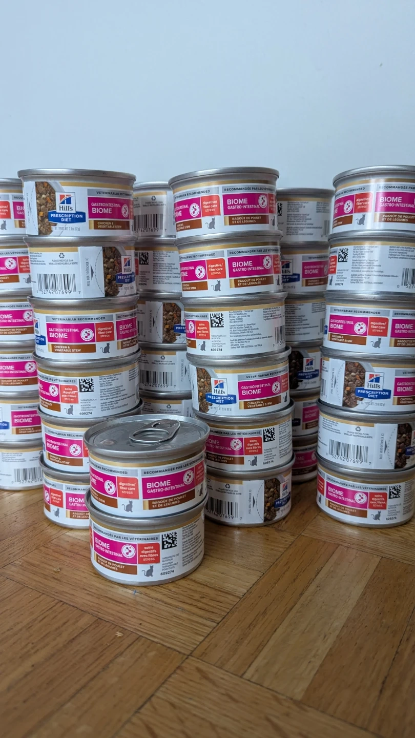 94Selling 68 cans of Hill's Prescription Diet Gastrointestinal Biome cat food. This is veterinarian-recommended and designed to help with digestive issues and fiber care stress. It's the Chicken & Vegetable Stew flavour. All were bought just this year.