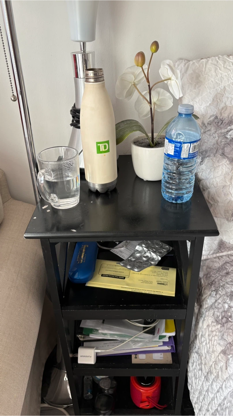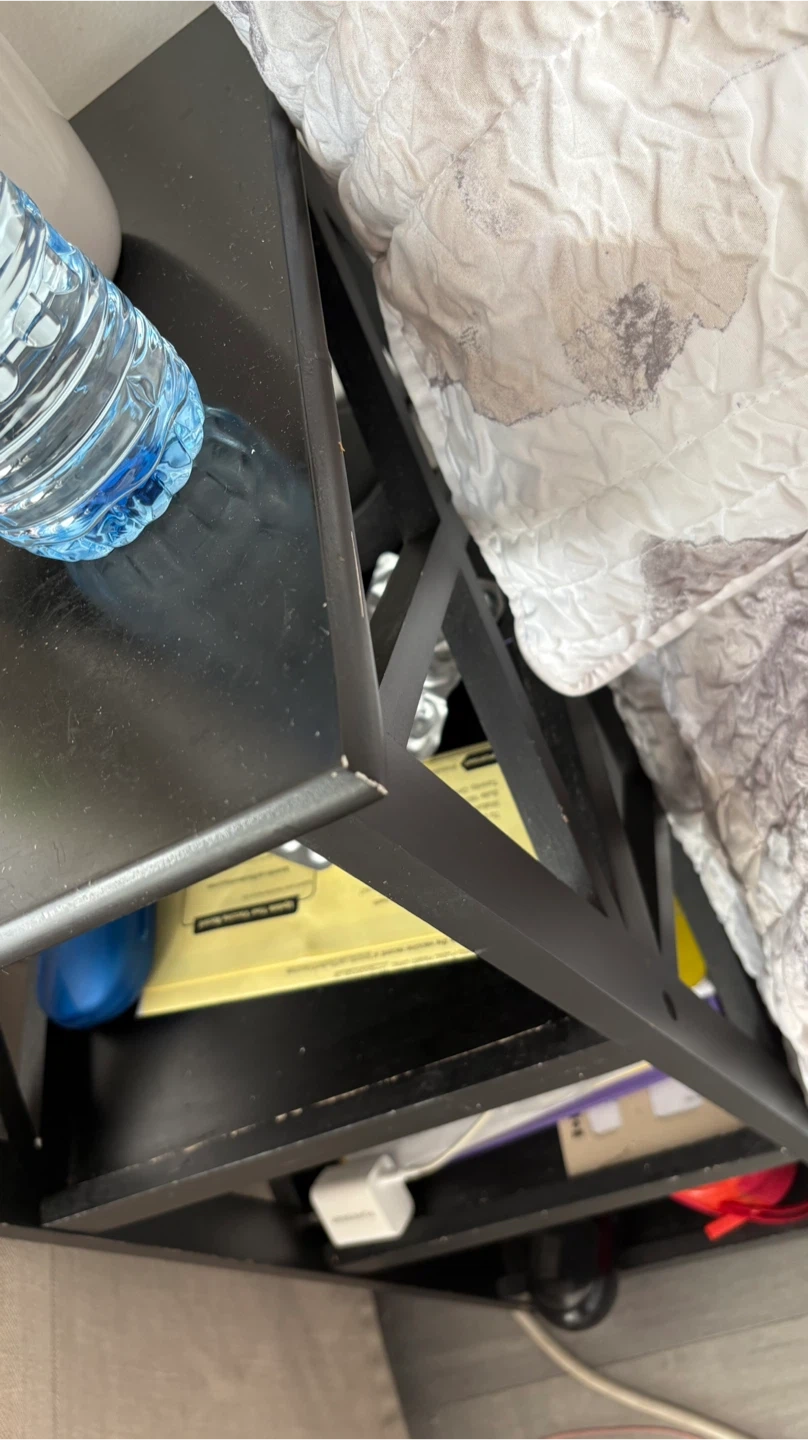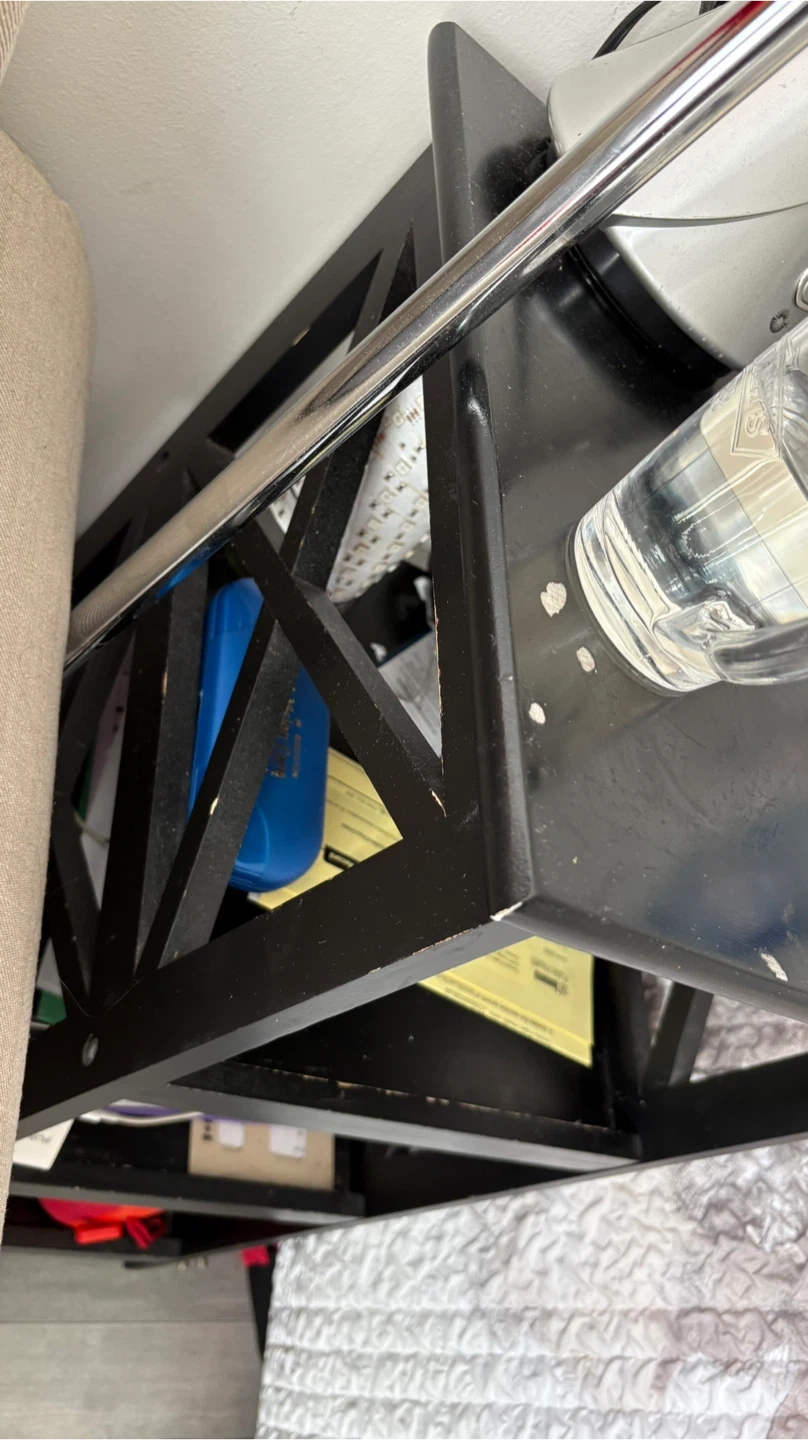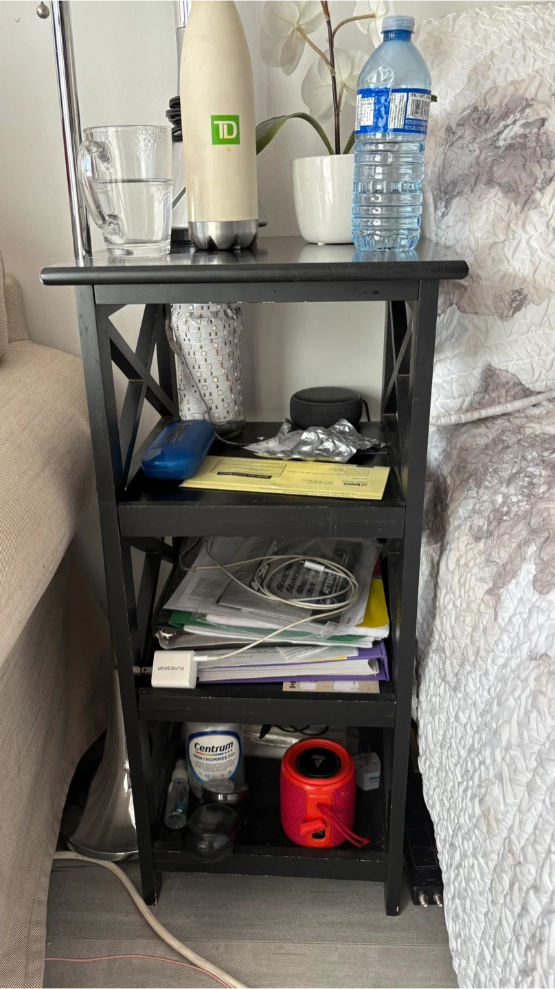 Selling a black wood side table. It has three shelves, perfect for storing books, magazines, or other items. It has some minor wear and tear, but is otherwise in good condition. Great for a bedroom or living room