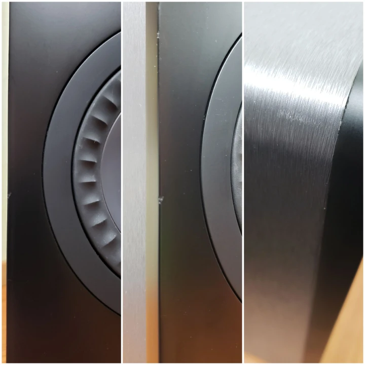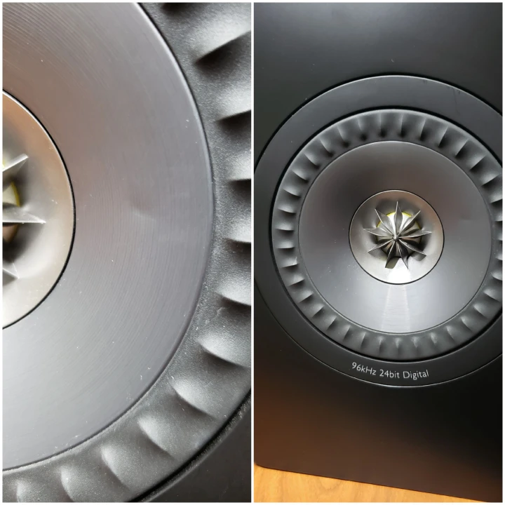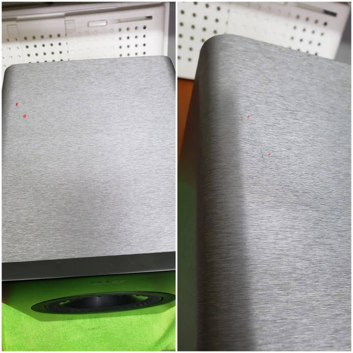 Photo 9 - I discovered a very minor dent in the woofer which I didn't see before (sorry, my eyesight isn't what it used to be). It has no effect on the sound. I tested and can hear no flaws and research online tells me the same.