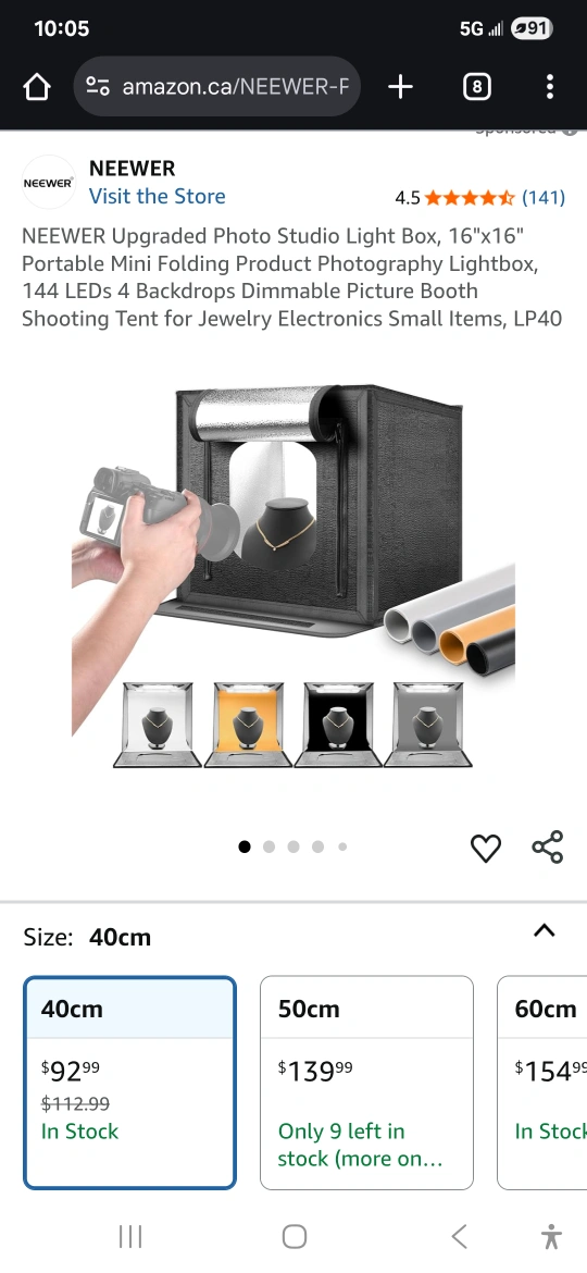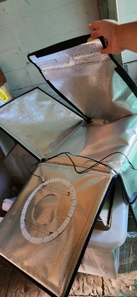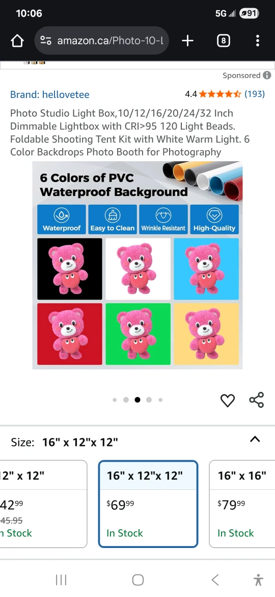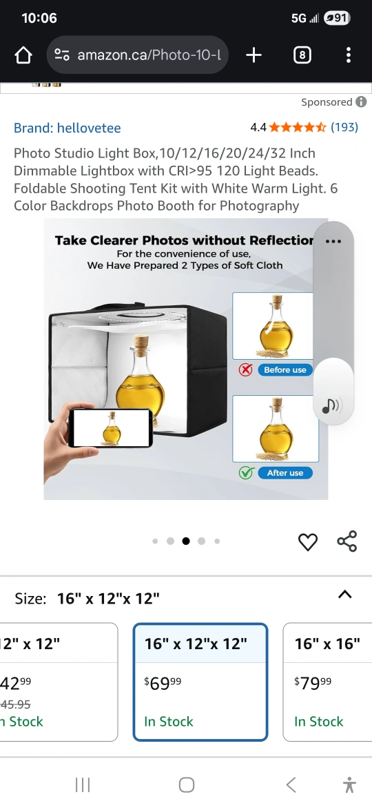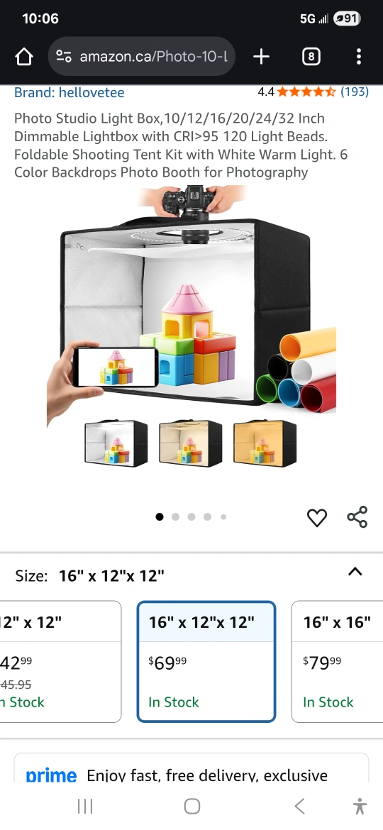 197Selling a brand new hellovotee Photo Studio Light Box! It's the 16" x 12" x 12" size. - Dimmable light box with CRI>95 - 120 light beads - Foldable shooting tent kit - Includes 6 colour backdrops and a soft cloth for cleaning