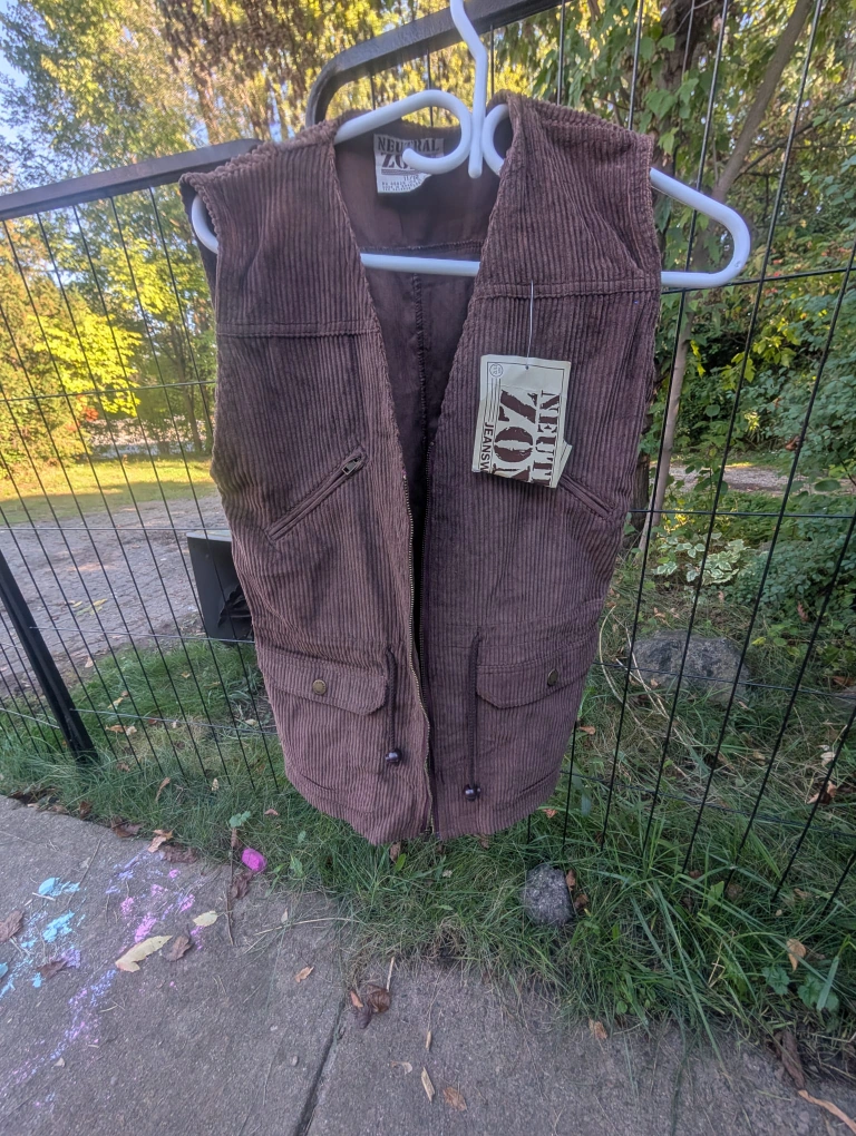 This is a gently used Neutral Zone vest in size 11/12. It is made of 100% cotton with a corduroy texture. The vest is brown and features multiple pockets. It's in great condition and ready for a new home