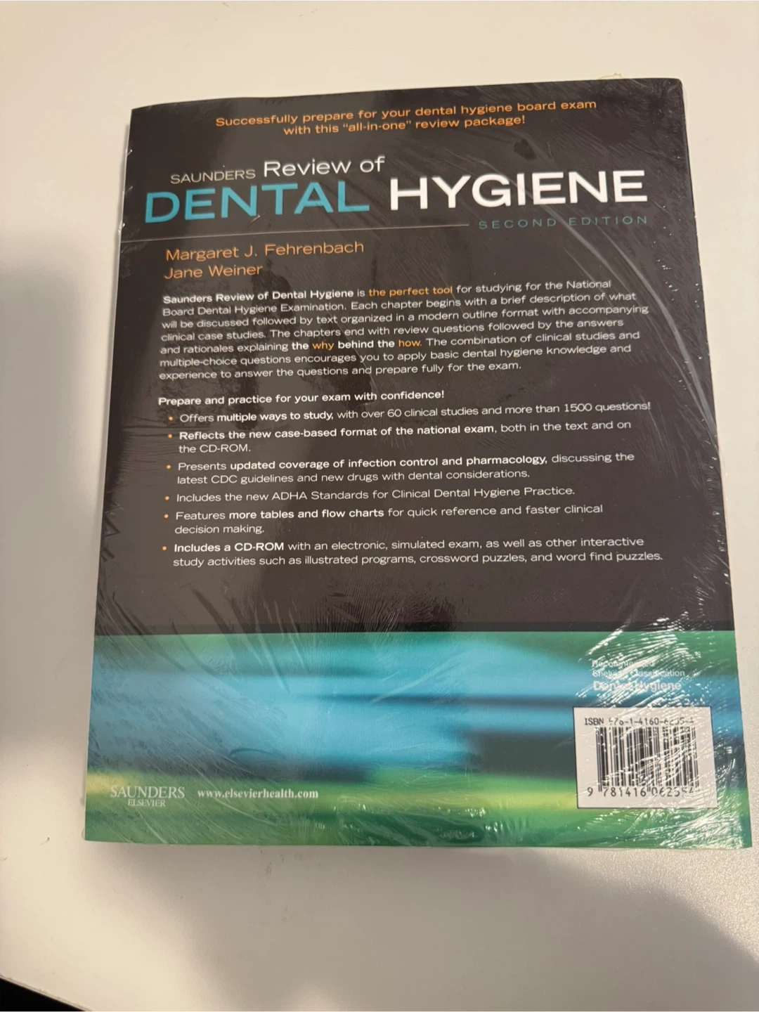 I'm selling a brand new, still-in-plastic copy of Saunders Review of Dental Hygiene, Second Edition by Margaret J. Fehrenbach and Jane Weiner! This textbook is perfect for preparing for your dental hygiene board exam and includes a CD-ROM with an electronic, simulated exam