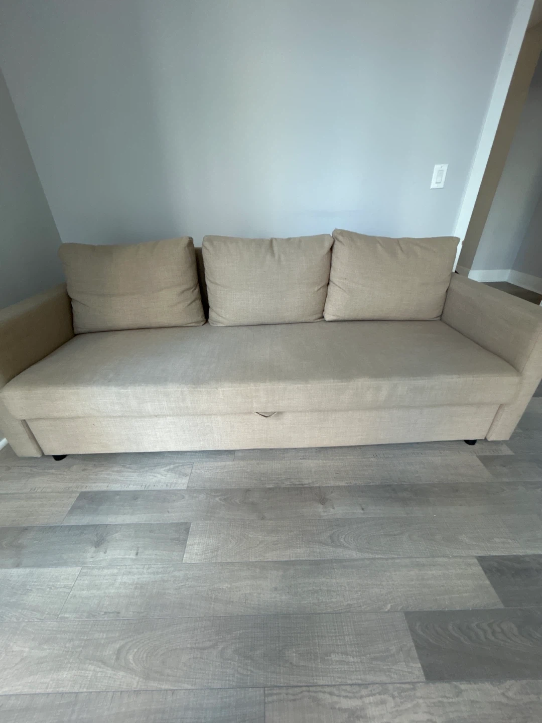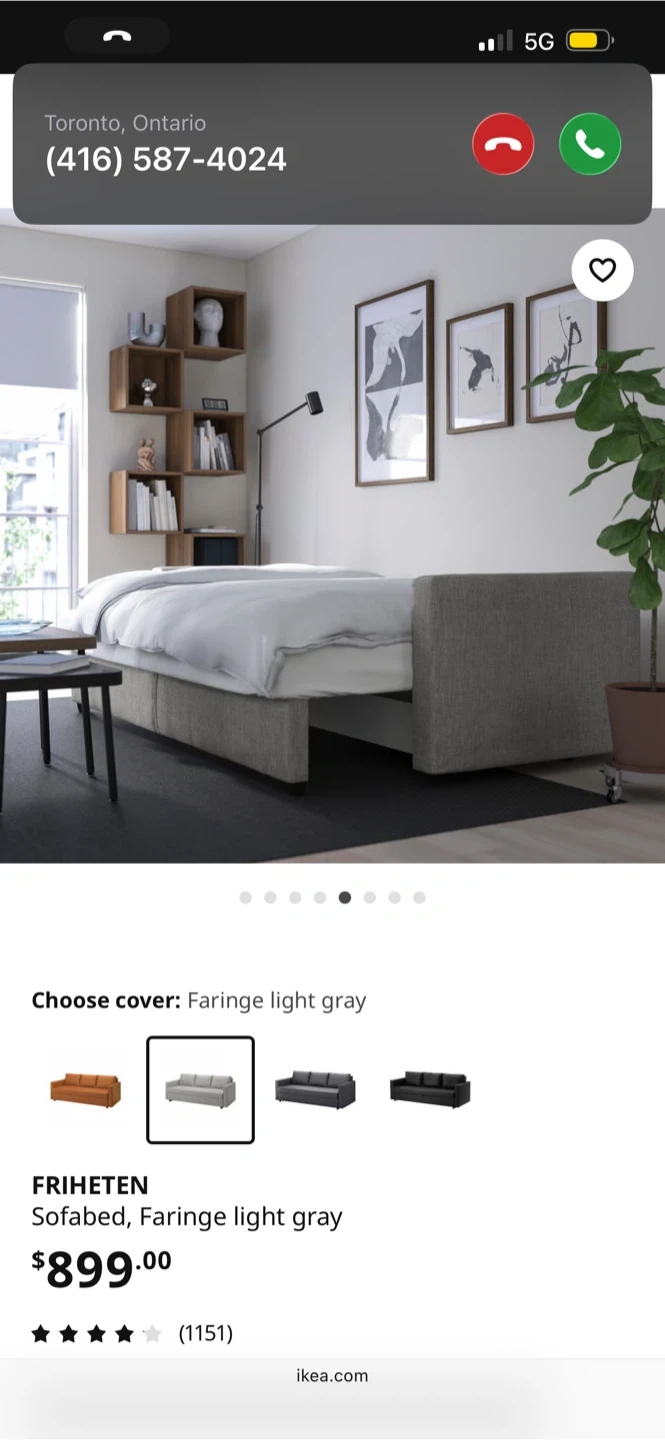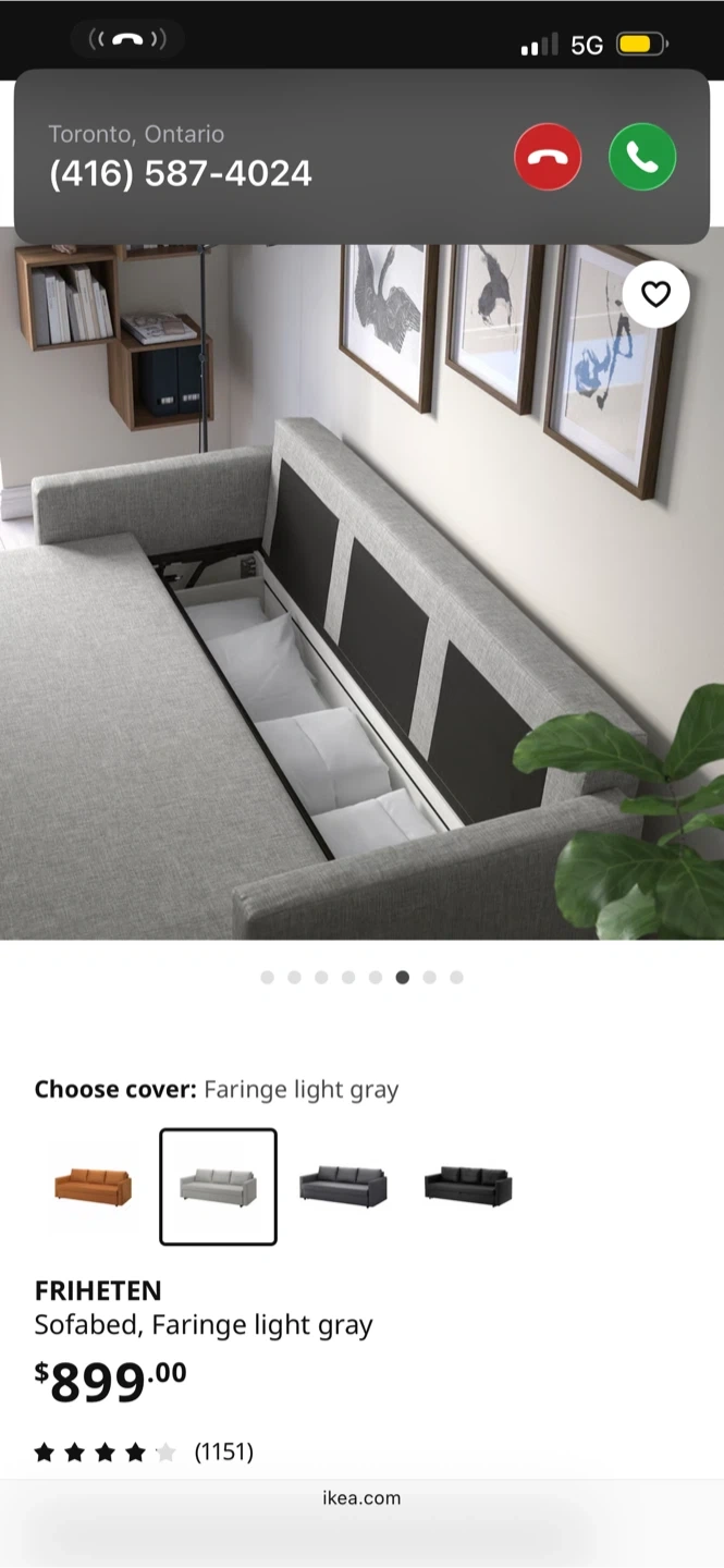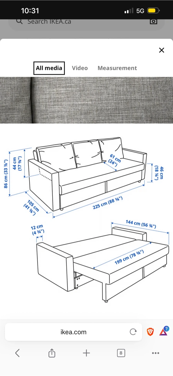 Selling an IKEA Friheten sofa bed in great condition! It's a comfy three-seater that easily converts into a bed, perfect for guests. Plus, it has built-in storage under the seat for blankets and pillows. Dimensions are 225 cm (88 5/8") in length, 86 cm (33 7/8") in height, and 105 cm (41 3/8") in depth. The seat depth is 61 cm (24"). Mattress width is 144 cm (56 5/8") and mattress length is 199 cm (78 3/8") Smoke free home, cat-friendly home: no rips or tears, a few loose threads. Structure is perfect. Pick up only today Friday October 3rd or Saturday October 4th. Cash only. Address is Bay St/Davenport Road