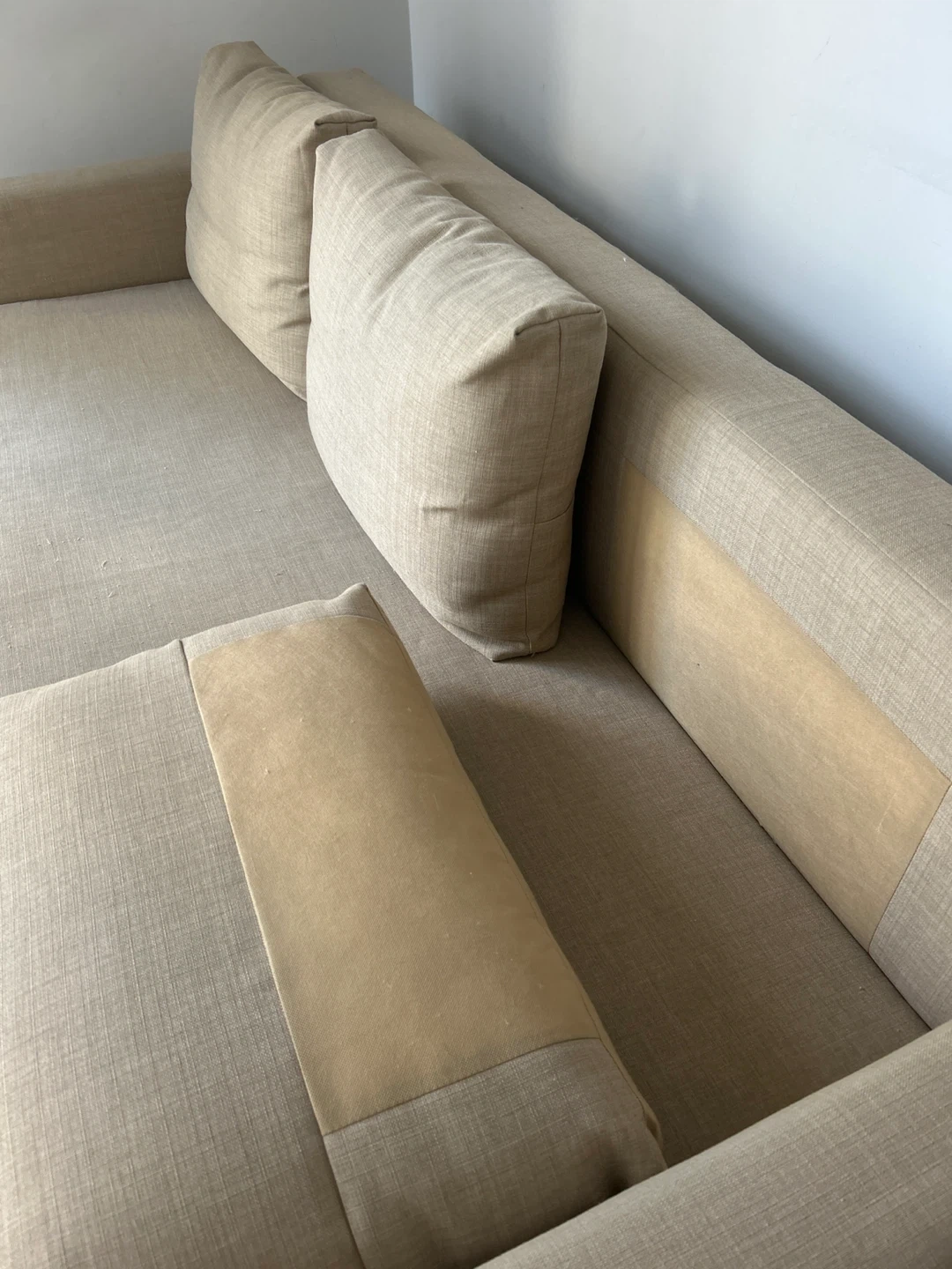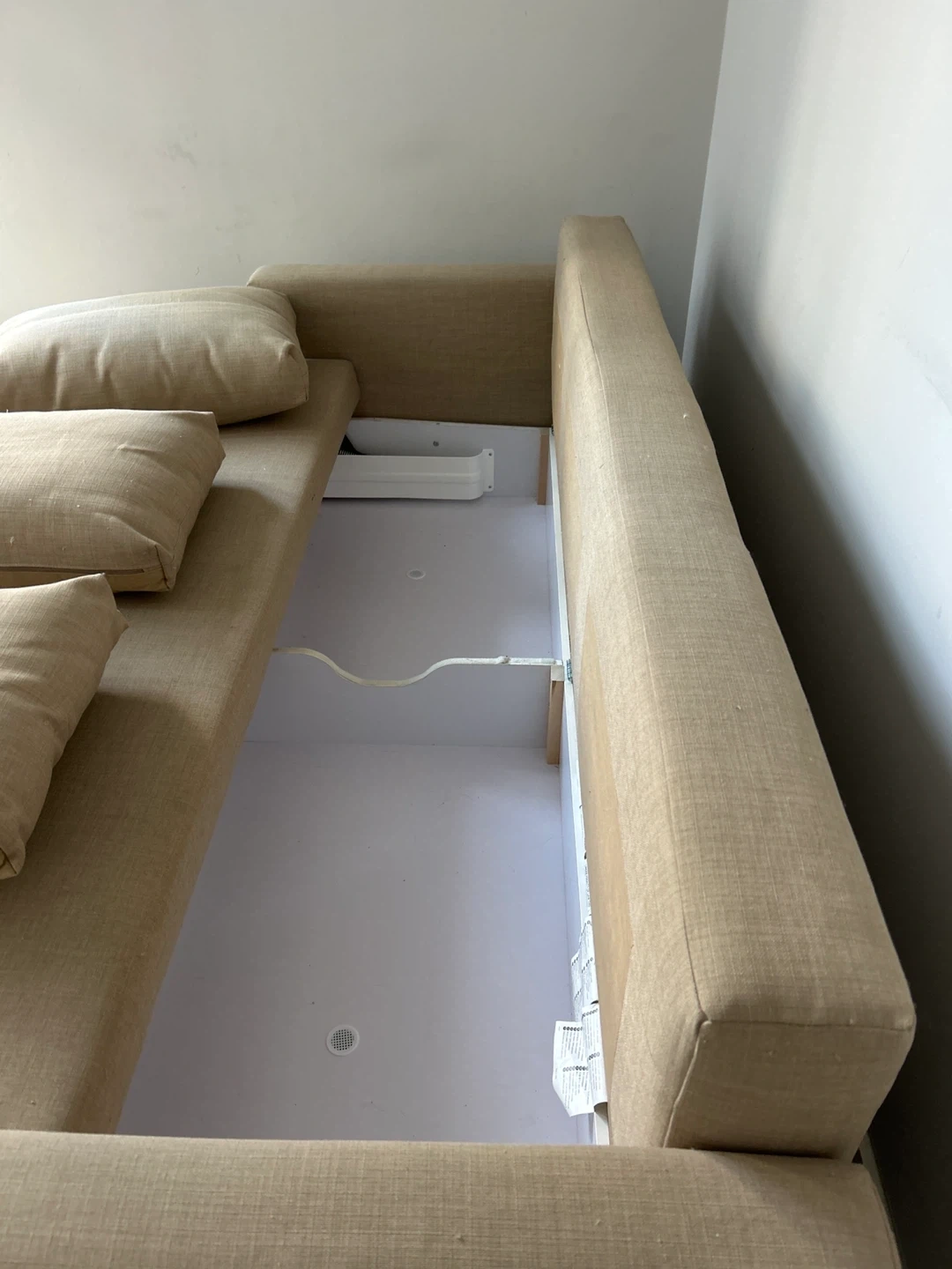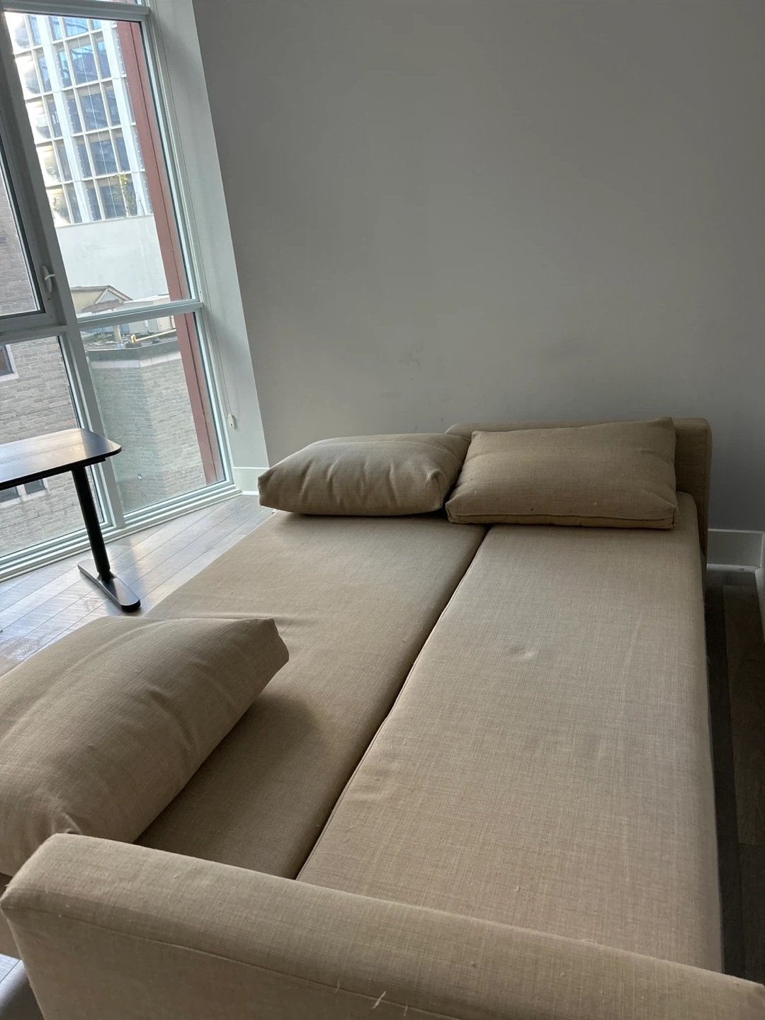 Selling an IKEA Friheten sofa bed in great condition! It's a comfy three-seater that easily converts into a bed, perfect for guests. Plus, it has built-in storage under the seat for blankets and pillows. Dimensions are 225 cm (88 5/8") in length, 86 cm (33 7/8") in height, and 105 cm (41 3/8") in depth. The seat depth is 61 cm (24"). Mattress width is 144 cm (56 5/8") and mattress length is 199 cm (78 3/8") Smoke free home, cat-friendly home: no rips or tears, a few loose threads. Structure is perfect. Pick up only today Friday October 3rd or Saturday October 4th. Cash only. Address is Bay St/Davenport Road