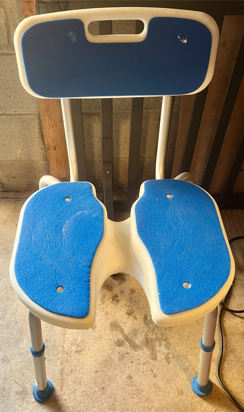 Selling a blue and white shower chair. It has a backrest and a padded seat for comfort. It's in good condition and ready to use in your bathroom!