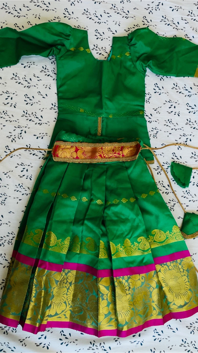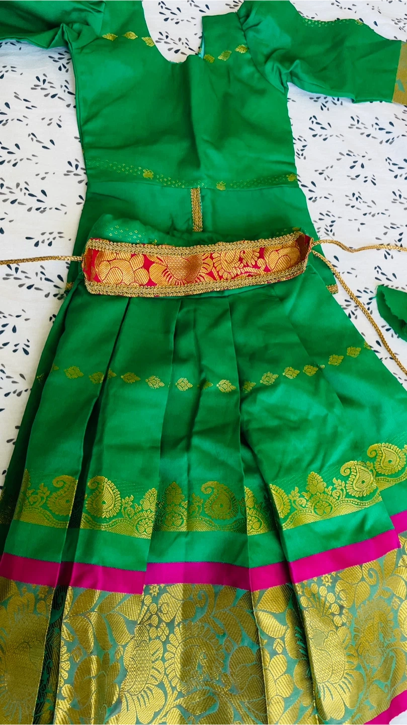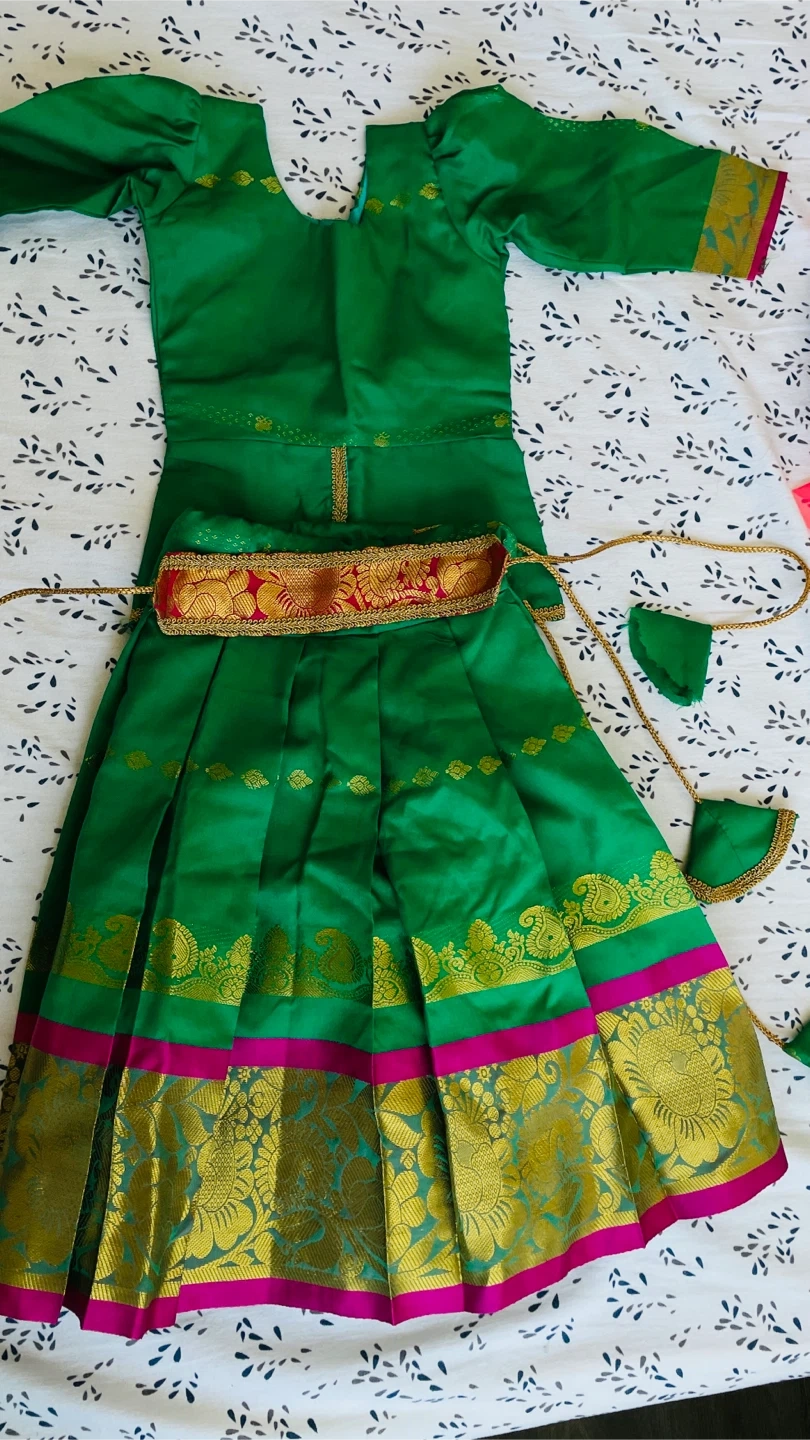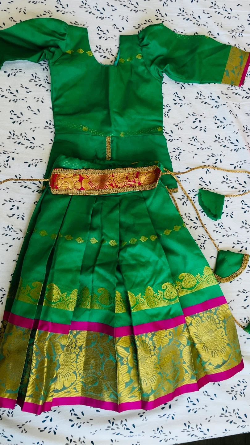 Selling a vibrant green Indian dress! It features gold detailing along the hem and a decorative belt. Perfect for a special occasion!