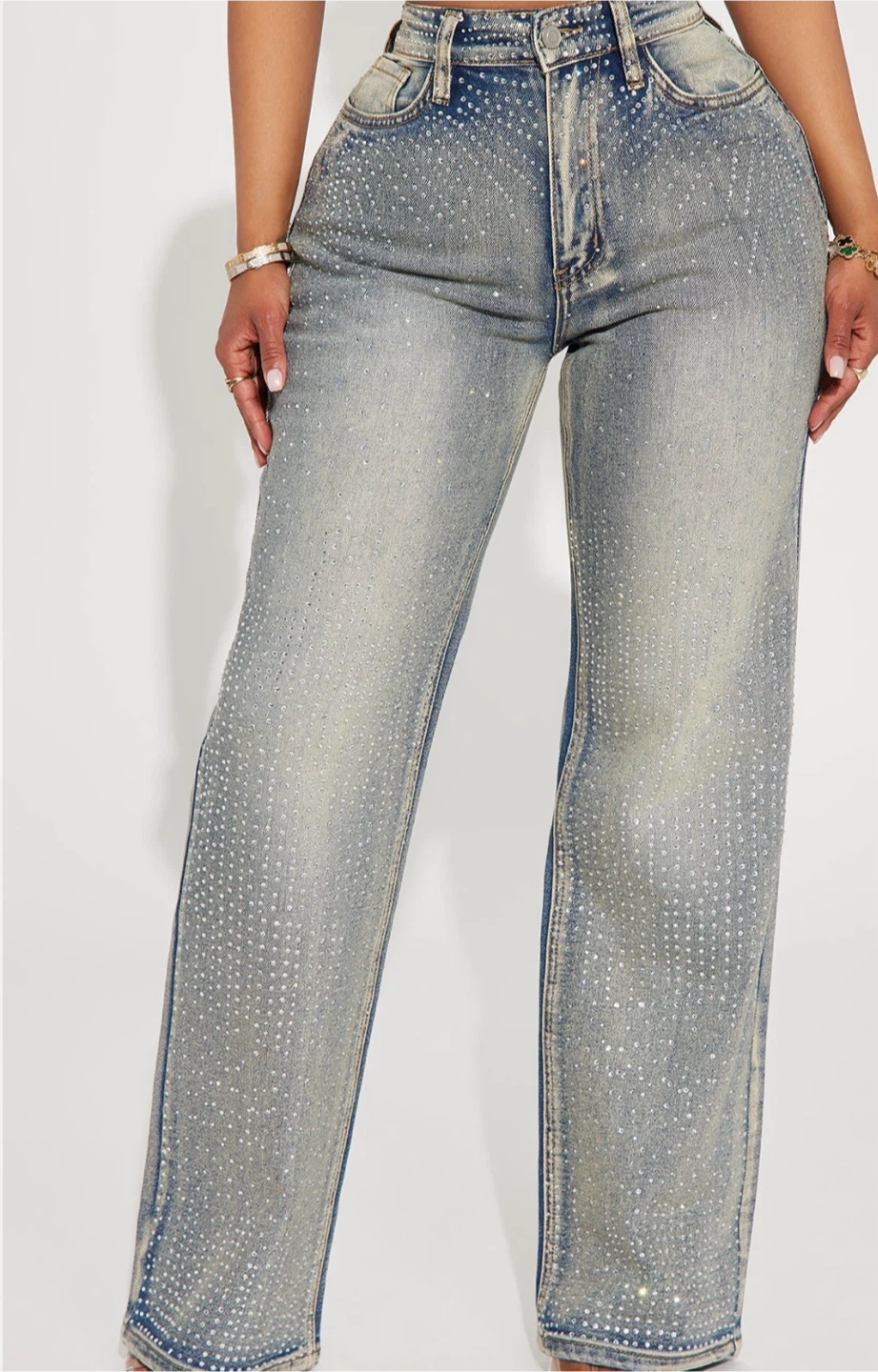 65These are a pair of Fashion Nova jeans with rhinestone detailing. They have a light wash denim colour and a straight leg fit. Perfect for adding a bit of sparkle to your wardrobe!