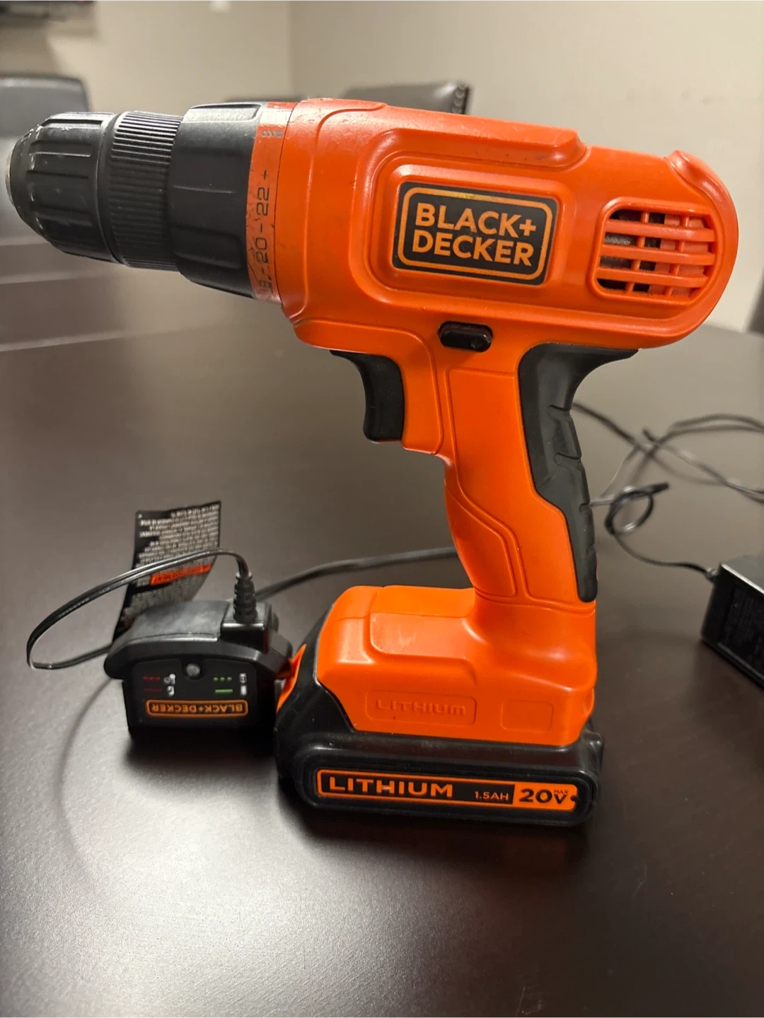 Selling a Black+Decker 20V cordless drill. It's in great shape and ready for your next project! It comes with a battery and charger so you're all set to go. This drill is lightweight and easy to handle, making it perfect for various tasks around the house or on the job site