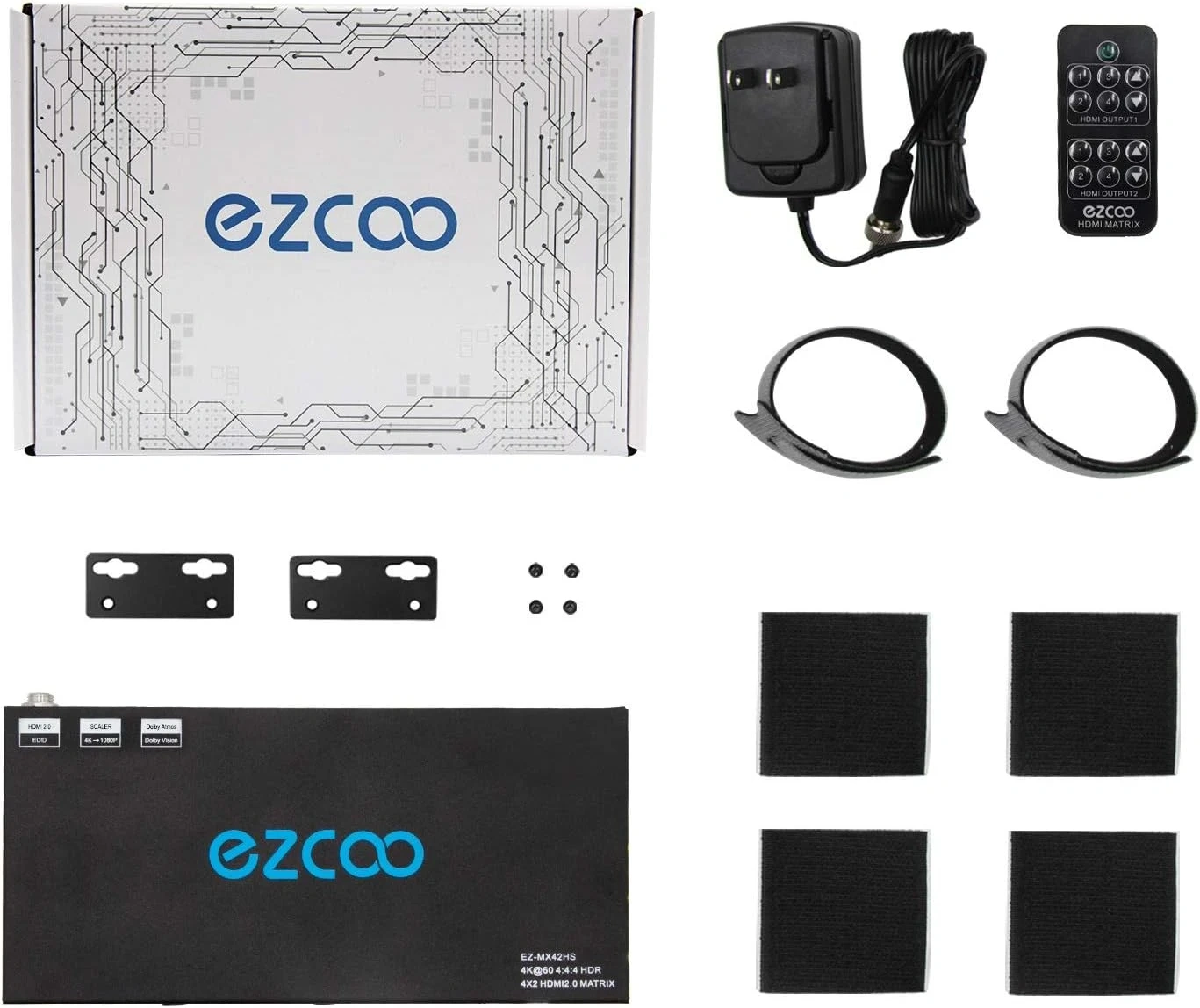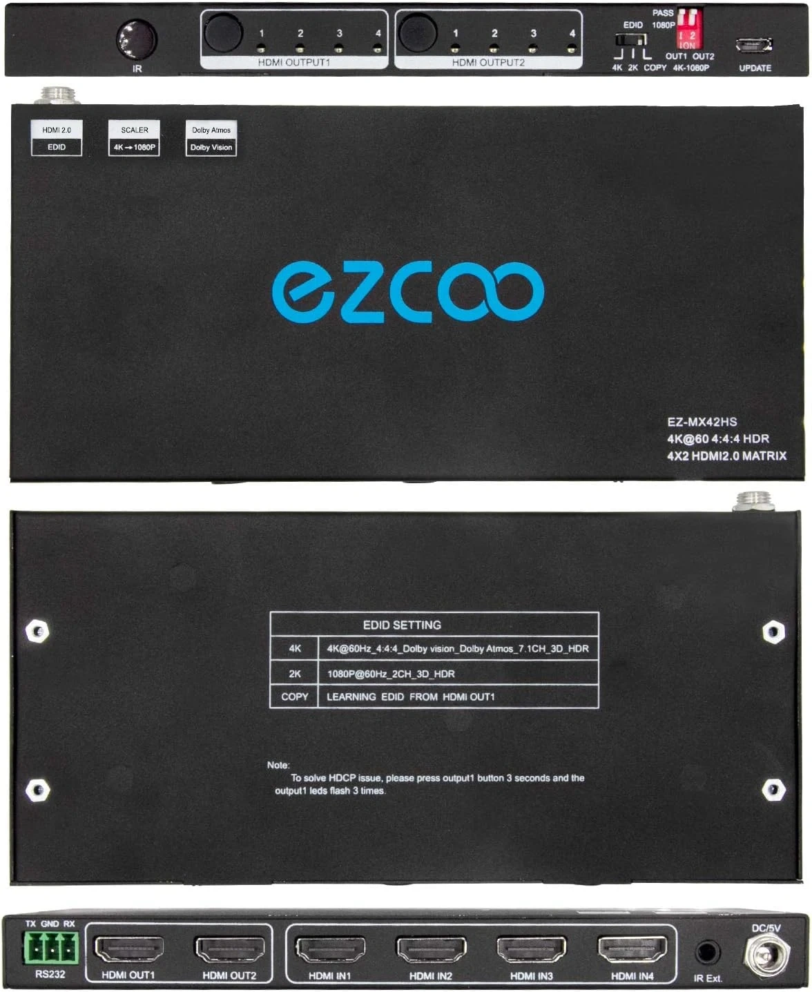 HDMI Matrix 4x2 4K 60Hz 4:4:4 HDR Dolby Vision Dolby Atmos with EDID Scaler Switch- HDMI Scale 4K 1080P, Firmware Upgrade HDCP 2.2 HDMI 2.0 Matrix 4 in 2 Out 18Gbps, RS232, IR Ext. Remote, Slim MX42HS