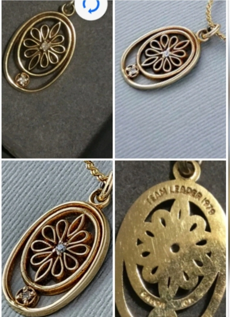Selling a vintage authentic genuine solid 10k yellow gold 2 diamonds charm that says 'Team Leader 1979' on it. It has a unique floral design. Great for collectors or anyone who loves vintage jewelry! has the split ring to put on a bracelet as well.