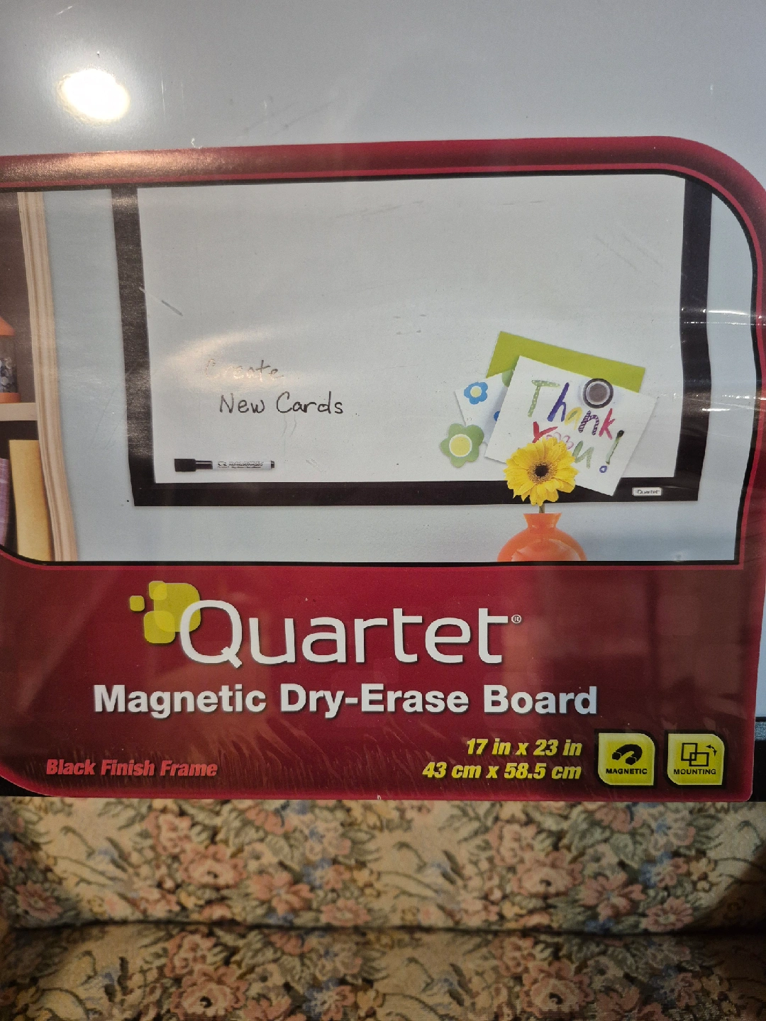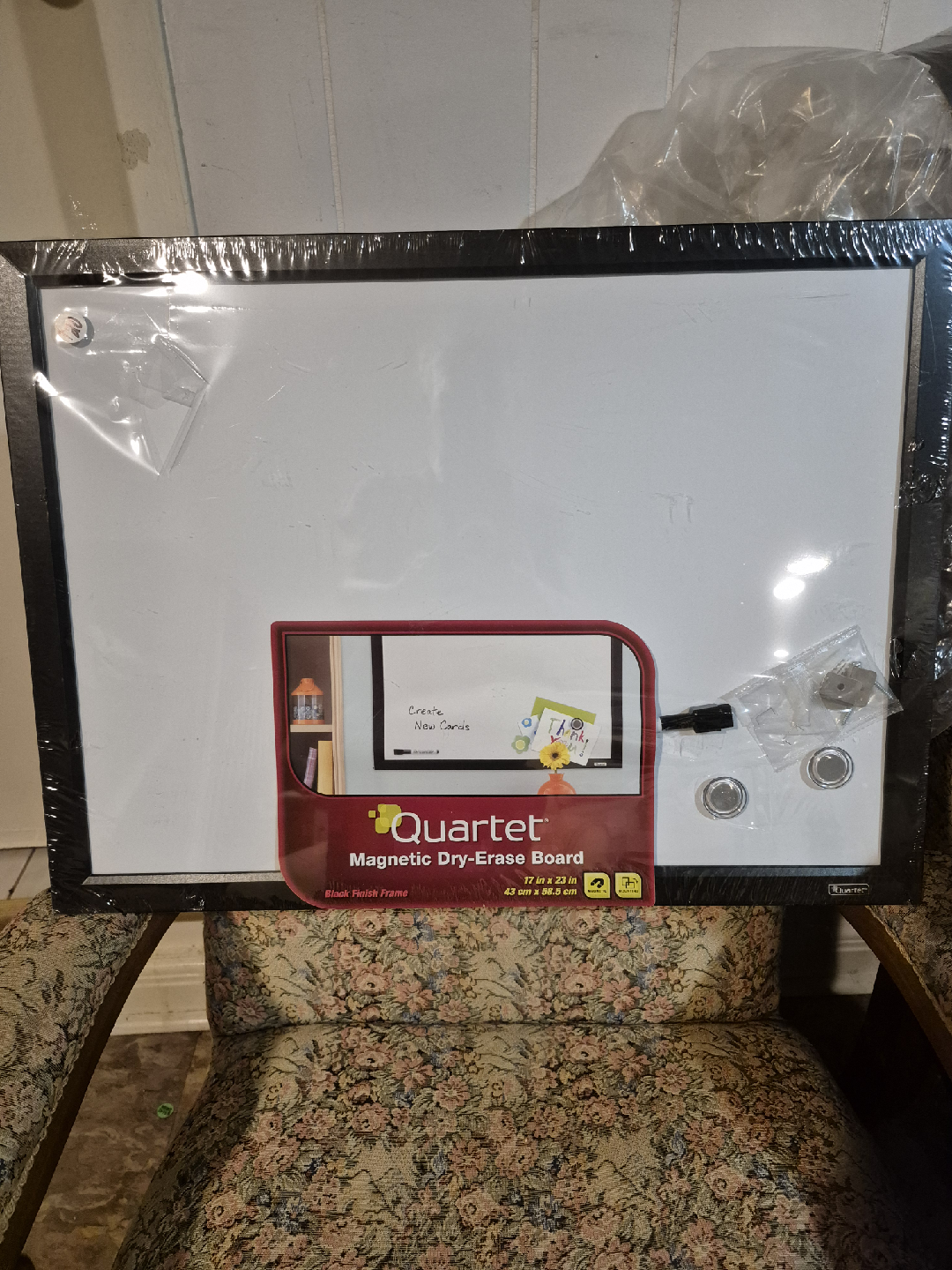 Selling a brand new Quartet magnetic dry-erase board! It's still in its original packaging and has never been used. The board measures 17 inches by 23 inches (43 cm x 58.5 cm) and has a black finish frame. It's magnetic, so you can easily attach notes and other items. Perfect for home, office, or school!