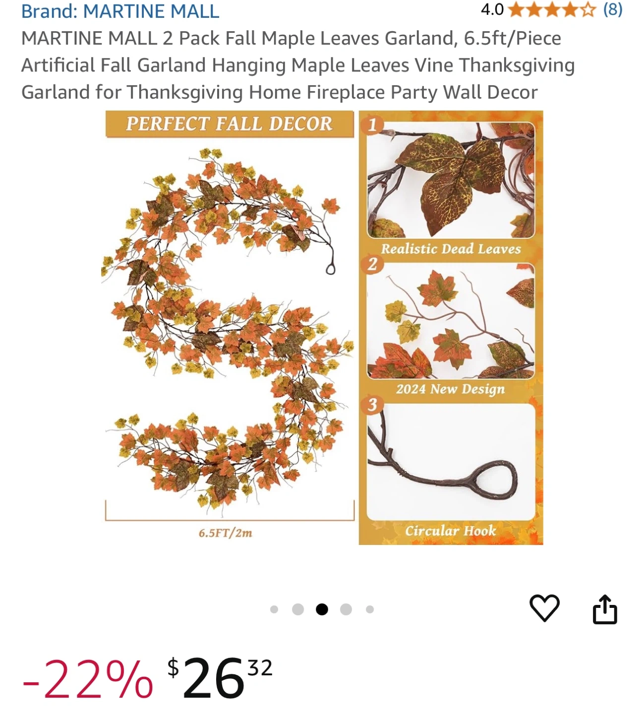 Selling a Martine Mall 2 Pack Fall Maple Leaves Garland. It's 6.5ft per piece, perfect for Thanksgiving home decor or party wall decor! Features realistic dead leaves and a circular hook for easy Backdrop