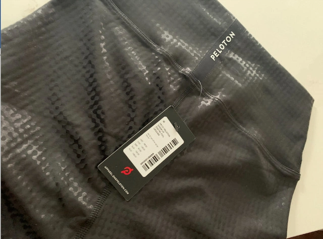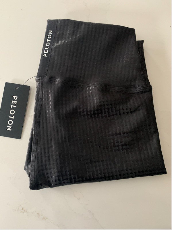 A glossy sheen and textured pattern add “extra” to this on-the-town pair. These leggings are where sophistication meets the sweat life with wicking, 4-way stretch tech, and head-turning chic. This style is part of our private label — a collection tested by you and perfected by us. Full length/28” inseam leggings 82% polyester/18% spandex High wide-band waist with seamed Peloton-stamped tape at the back. Bought for $144 incl tax. Selling for $100. Price is firm.