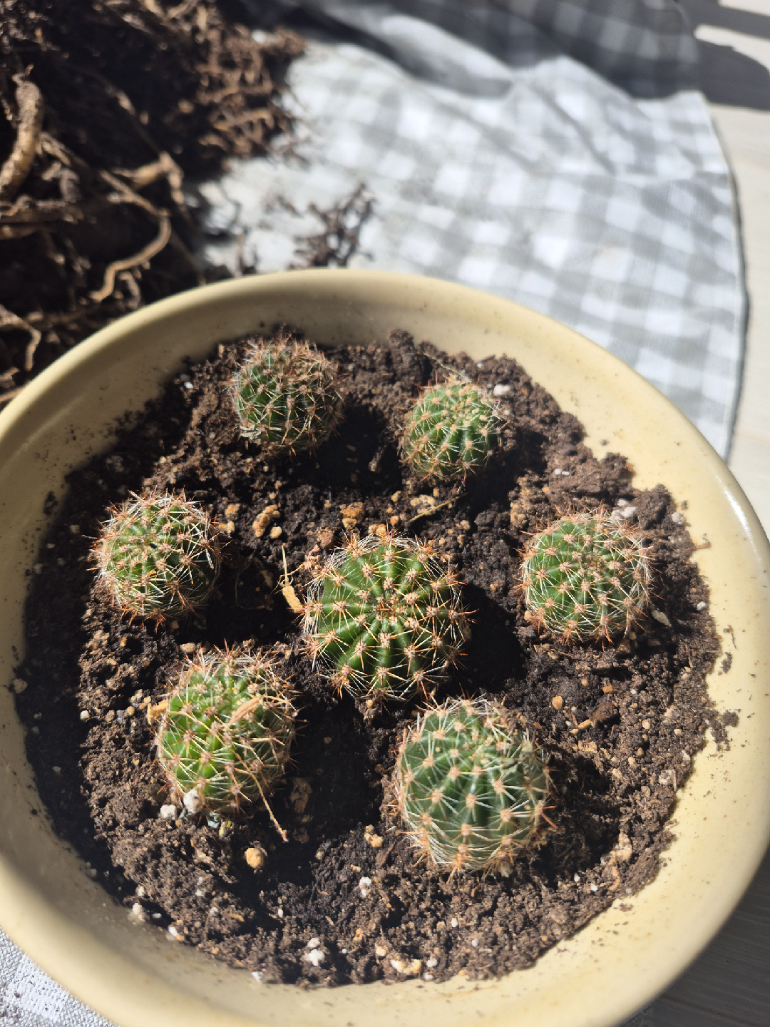 Selling a pot of small cactus plants, perfect for adding some greenery to your home! They are in a yellow pot, ready to be placed in a sunny spot. These little guys are easy to care for and will bring a touch of nature to any space