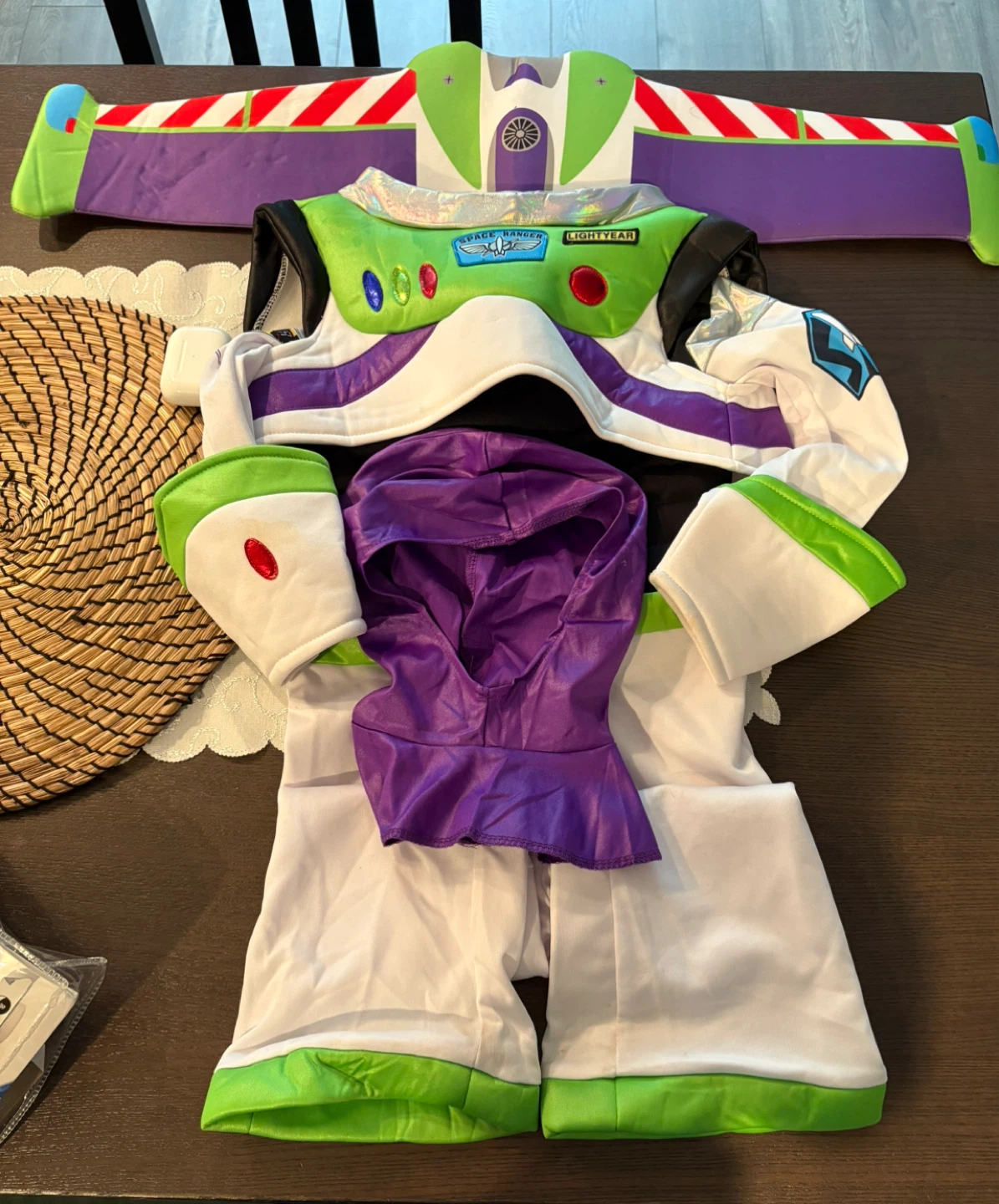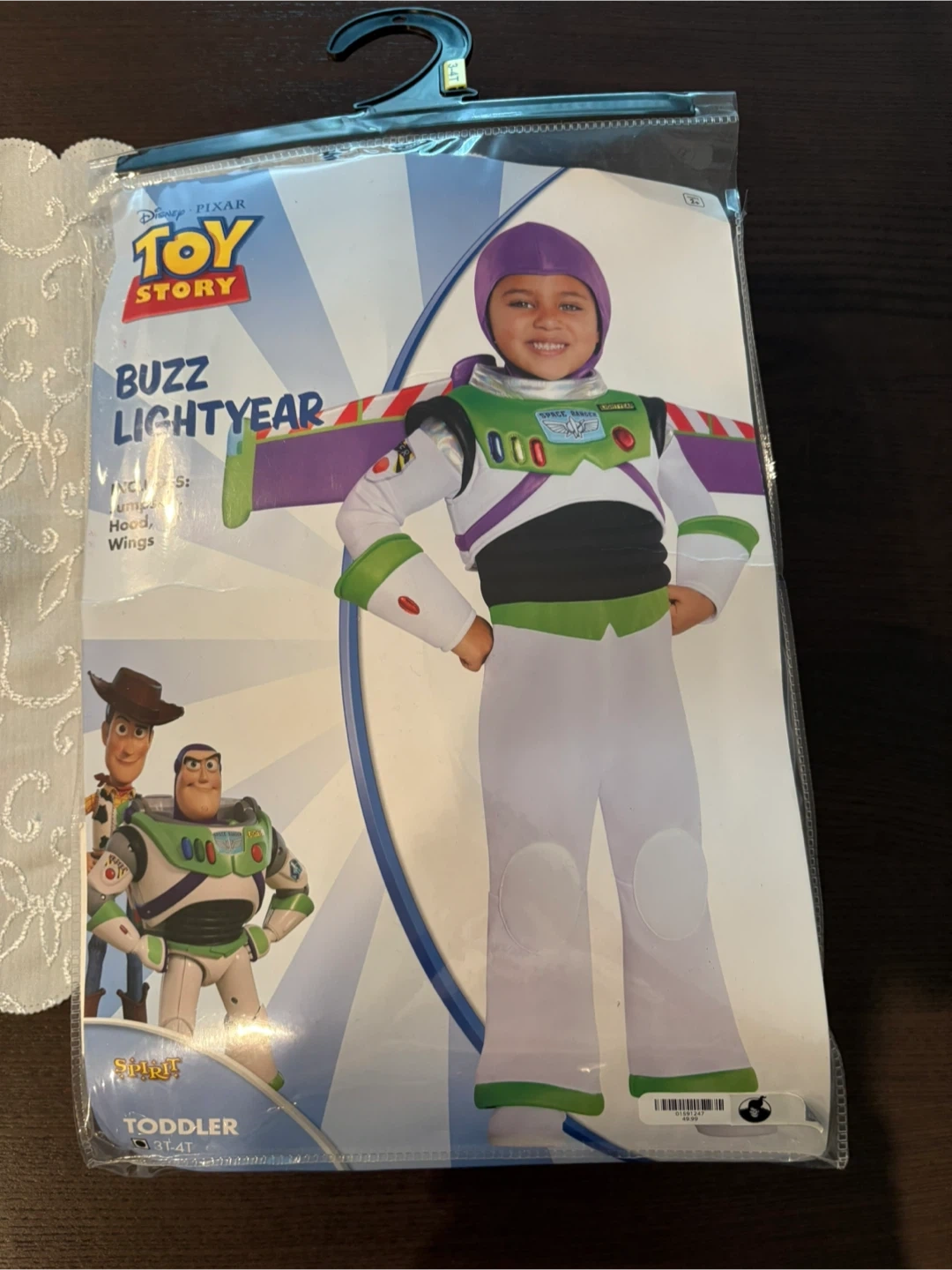 Your little one can dress up as Buzz Lightyear with this adorable costume! It's a toddler size 3T-4T and includes the jumpsuit, hood and wings. Great for Halloween or just for fun!