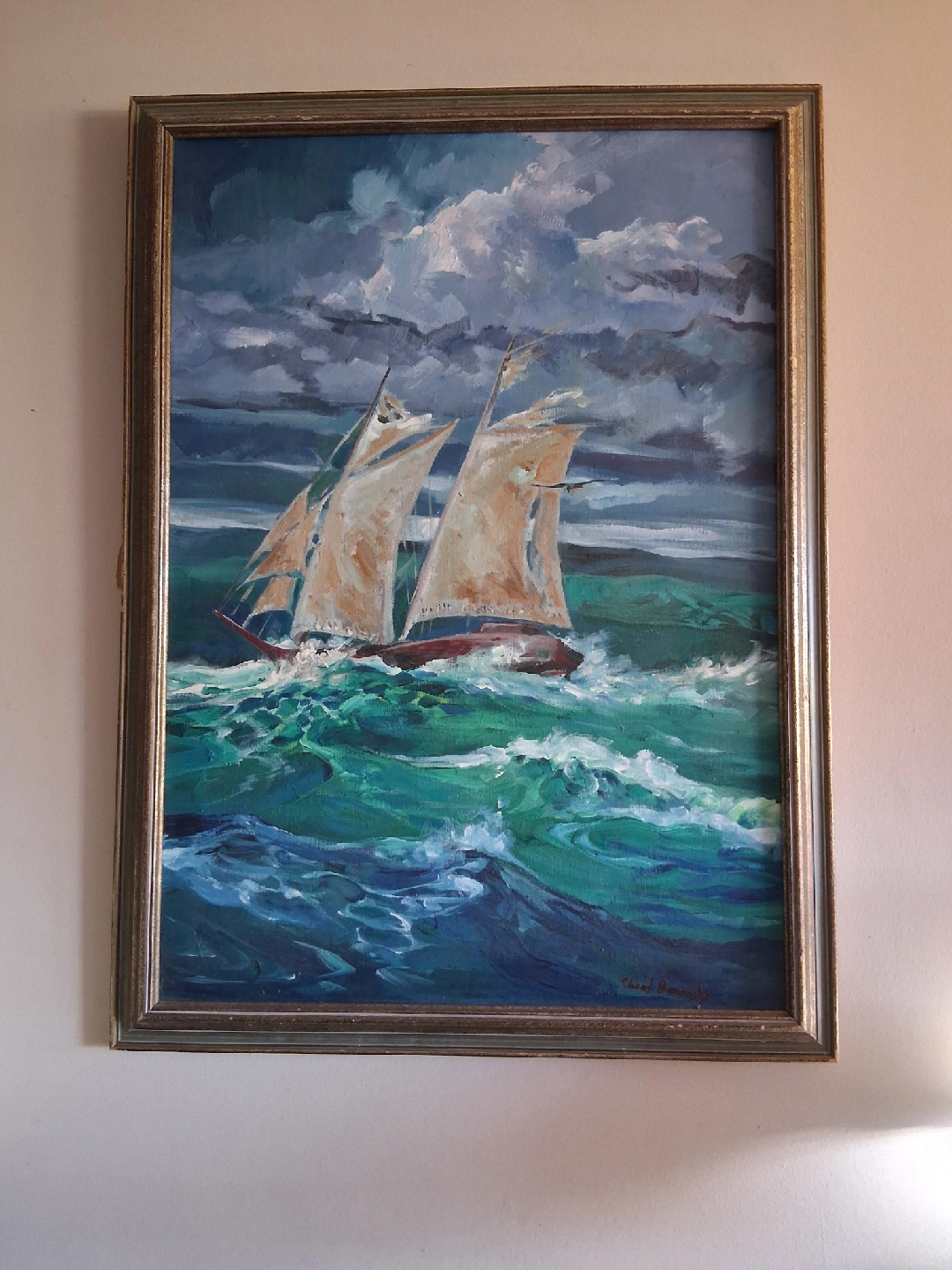 This is an original oil painting of a sailboat braving rough seas. It's framed and ready to hang, adding a touch of nautical charm to any room. The frame is great for another project.