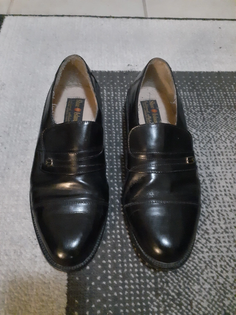These are a pair of black leather loafers from Shoe Island. They're part of the Traditional Collection.