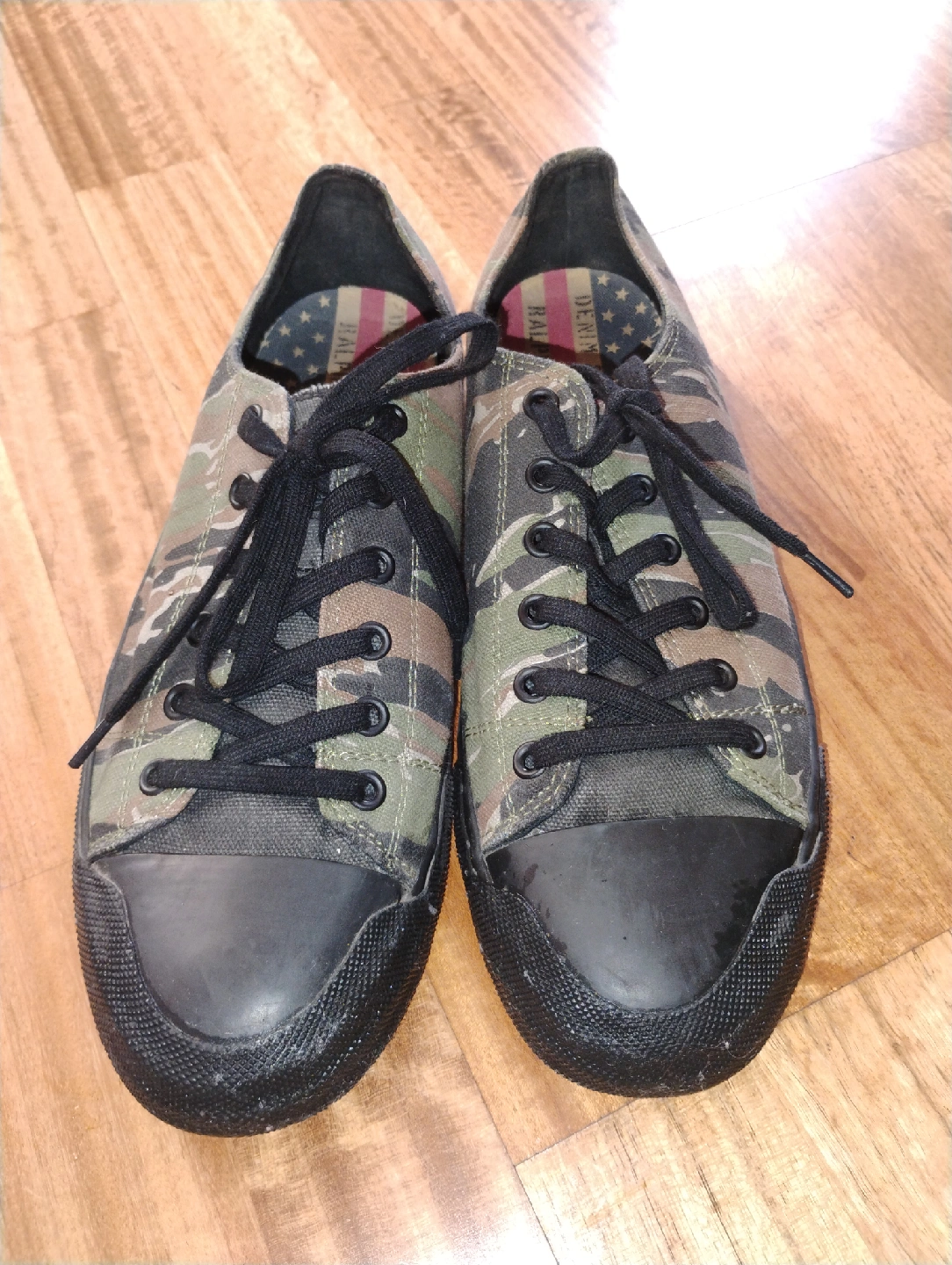 Selling a pair of Ralph Lauren sneakers with a cool camo pattern! They're in great shape and would be a stylish addition to your wardrobe. Cash only.