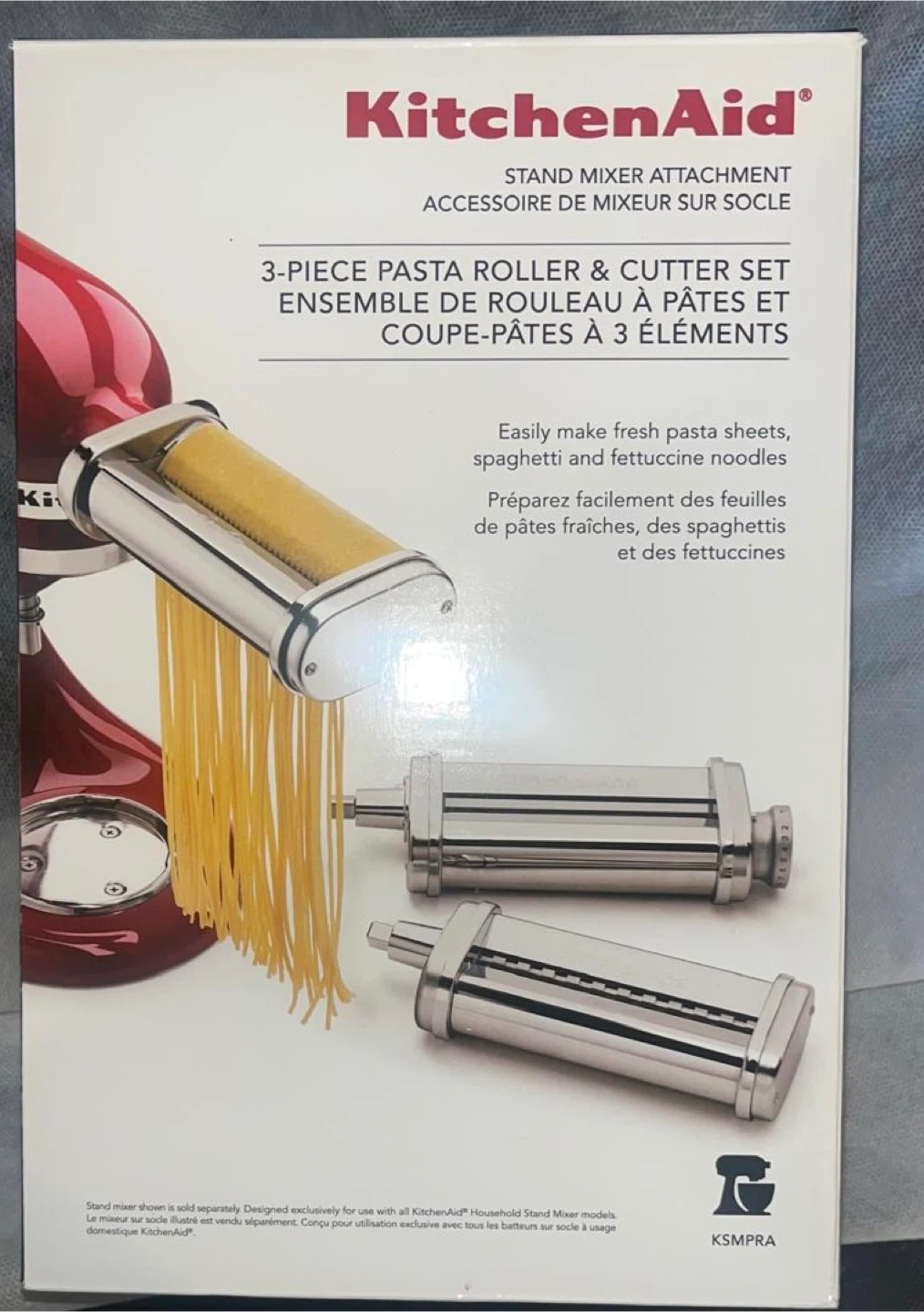 I'm selling a brand new KitchenAid 3-piece pasta roller and cutter set! This accessory makes fresh pasta sheets, spaghetti and fettuccine noodles easily. It's designed for use with all KitchenAid Household Stand Mixer models. Box included