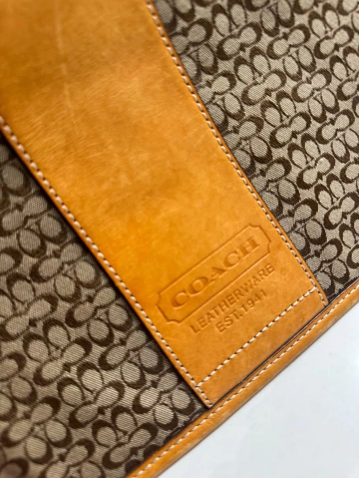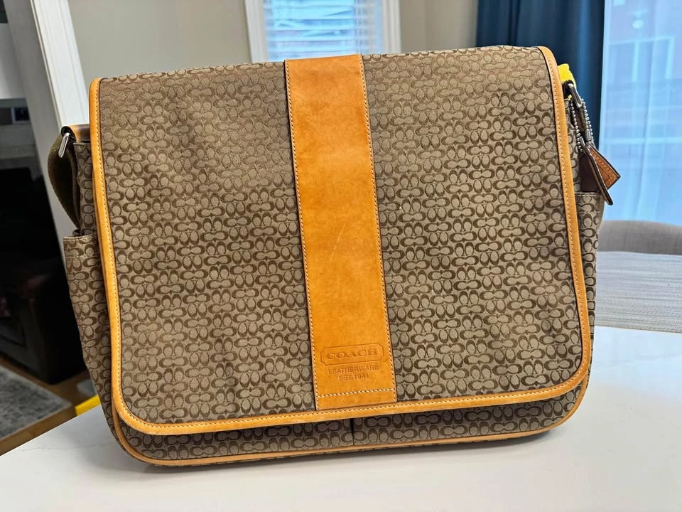 Coach laptop bag. Coach log on fabric with real leather trims. 17’ X 14’ 2 outer front pockets. 2 outer side pockets. One divider inside bag. Tags still on. Long adjustable strap as cross-body or shoulder strap. Price firm. Pick up only. Read description and look at pictures carefully before messaging for questions .