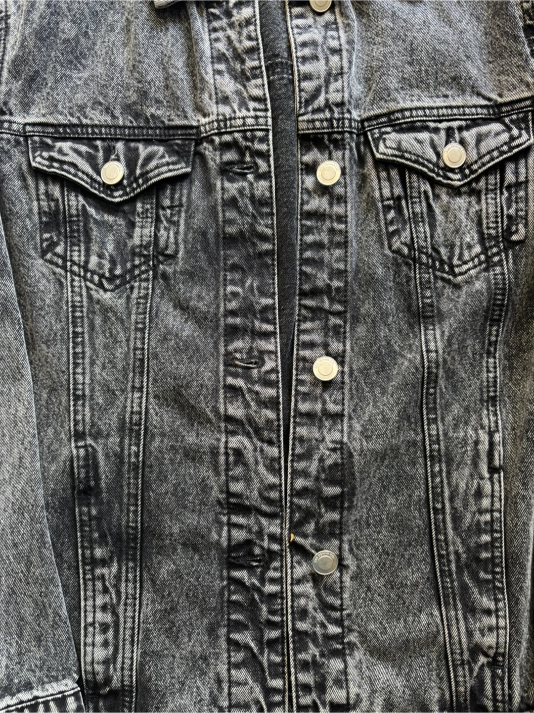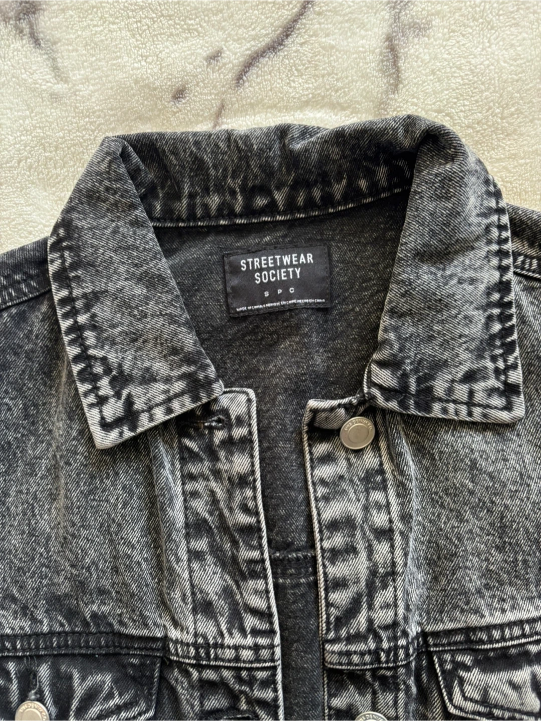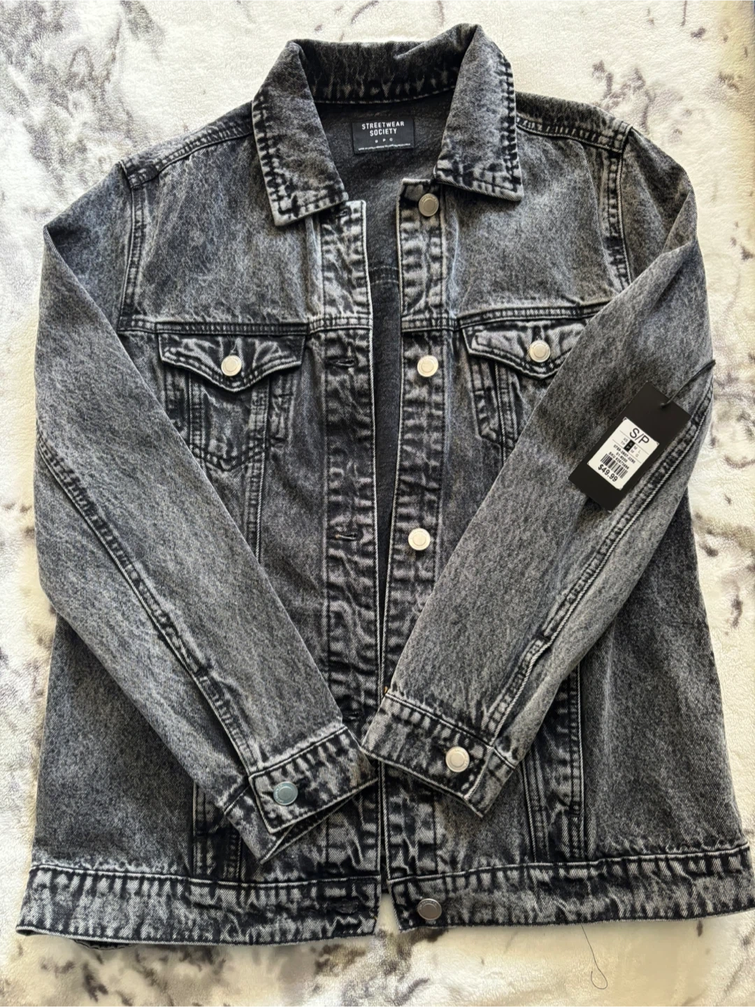 Selling a Streetwear Society denim jacket in size small. It's a stylish and comfortable piece, perfect for layering or wearing on its own. The jacket features a classic design with a button-up front and chest pockets. The material is durable and has a nice, slightly faded wash. Brand new condition, with tags.