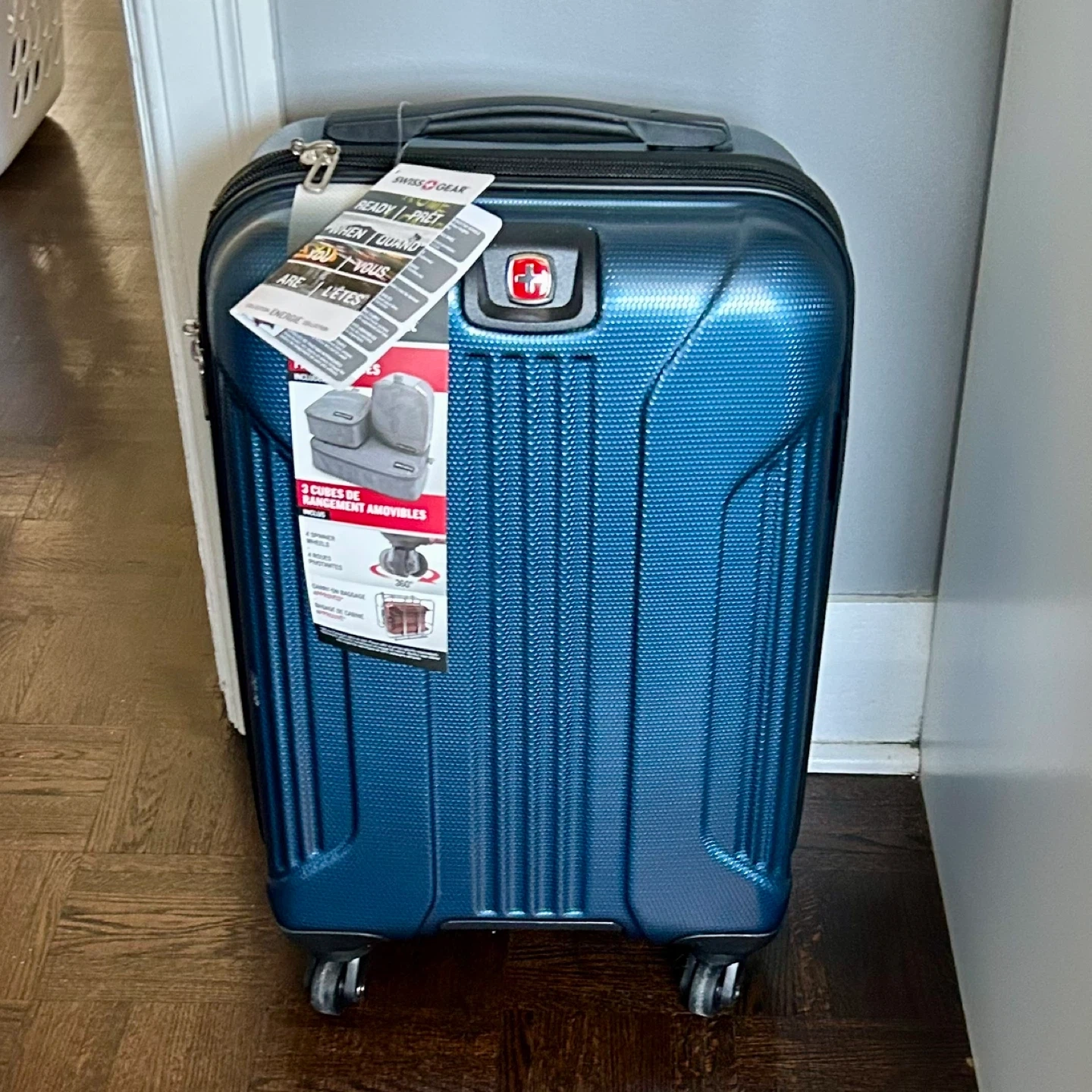 Swiss Gear carry-on luggage in a nice blue colour! It comes with 3 removable packing cubes and 4 spinner wheels for easy moving. Great for travel! Brand new!