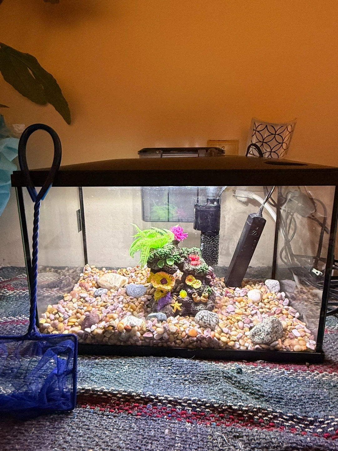 Selling a fish tank that comes with gravel, decorations, a filter, heater, and a net! It's all set up and ready to go for a new home